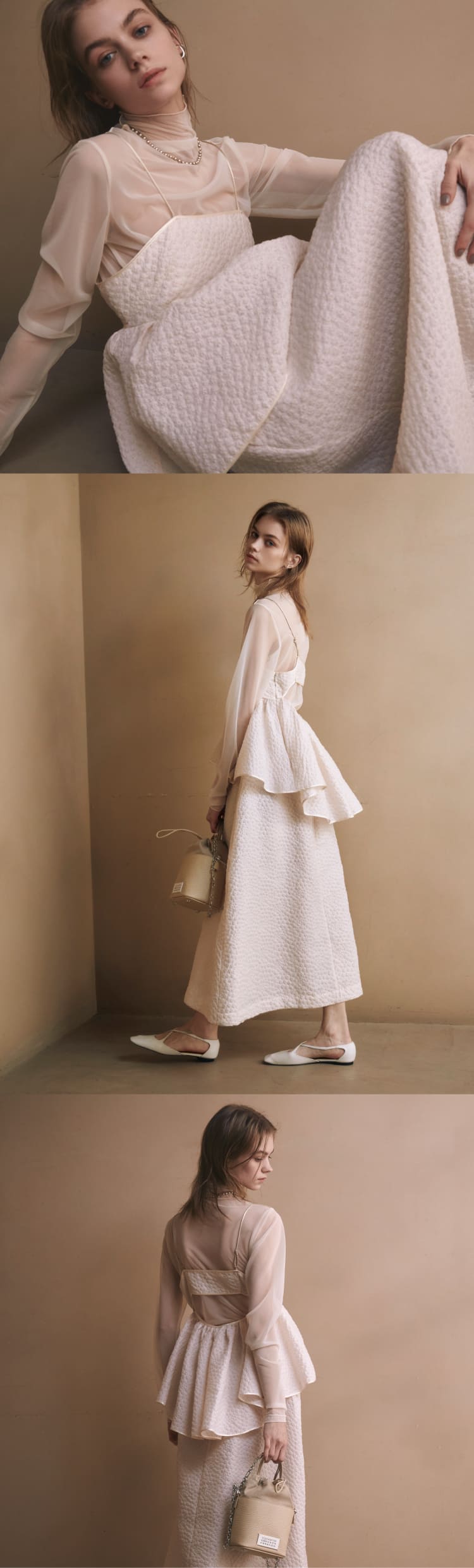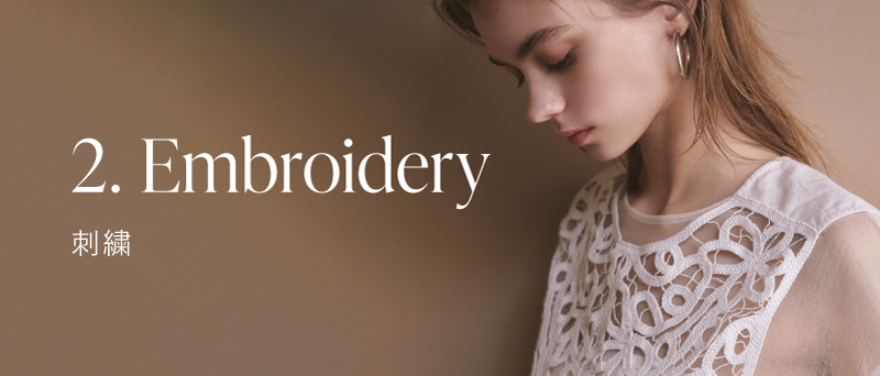 フラワー柄ジャガード素材を使用したシリーズ。ほのかにシアー感のある独特なインポート生地を採用したこだわりの逸品。薄手ながらもややハリがあり、キャミソールやスカートのフレアシルエットを優美に演出。