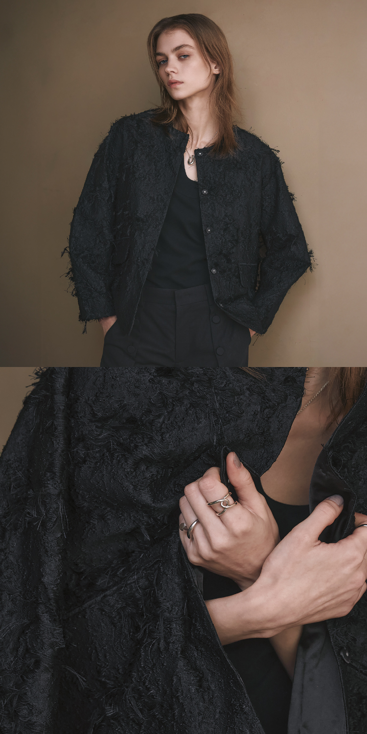 繊細なカットジャガード素材のノーカラージャケット。ふわふわの表情豊かな長い毛足が特徴。合わせるアイテム次第でデイリーからオケージョンまで、幅広いシーンに活躍する。