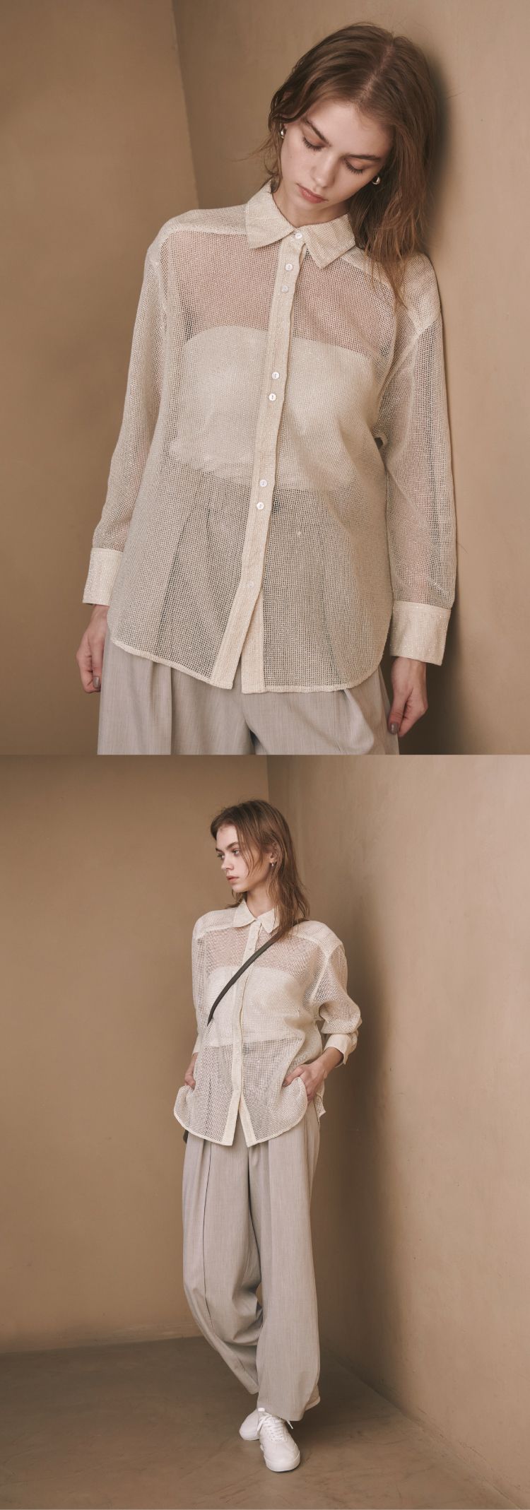 コットンをベースにラメ糸を合わせたメタリックネットシャツ。ラメの輝きとネットの透け感が軽やかな雰囲気に。ベーシックシャツだからこそ、トレンド素材を取り入れてアップデート。