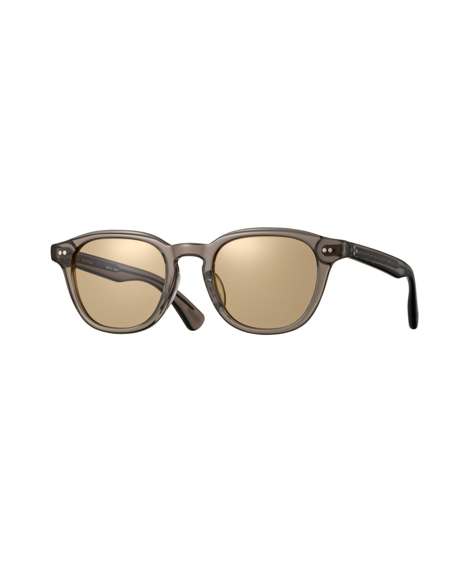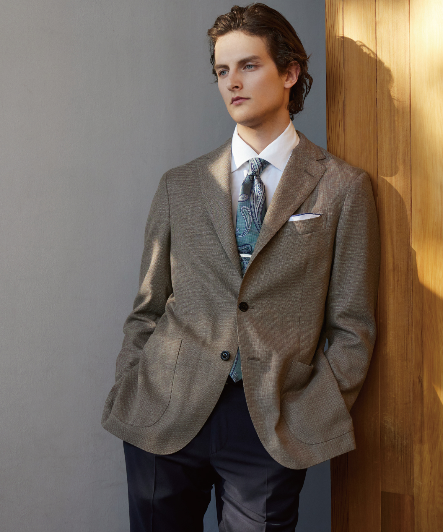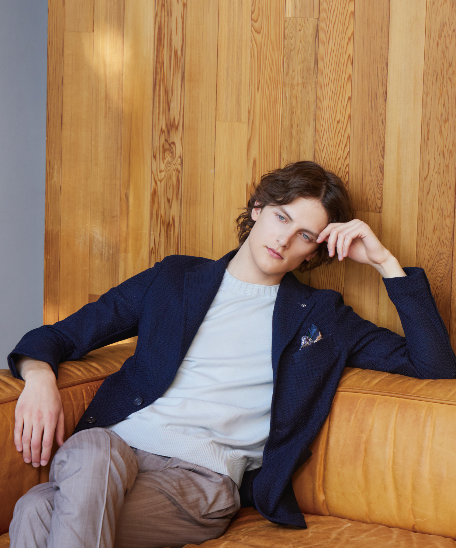 落ち着いたトーンのテーラードジャケットはサマーウールを使用しており、クレープ状のややシボ感のある独特な織柄が特徴。パンツや小物で取り入れたアクセントカラーのネイビーが全体の色バランスをまとめている。