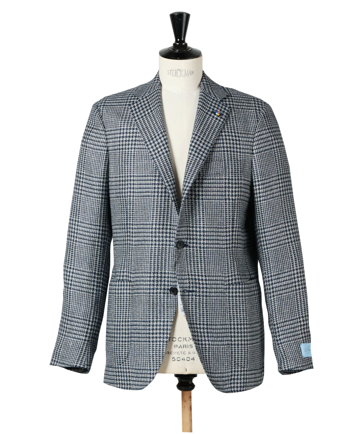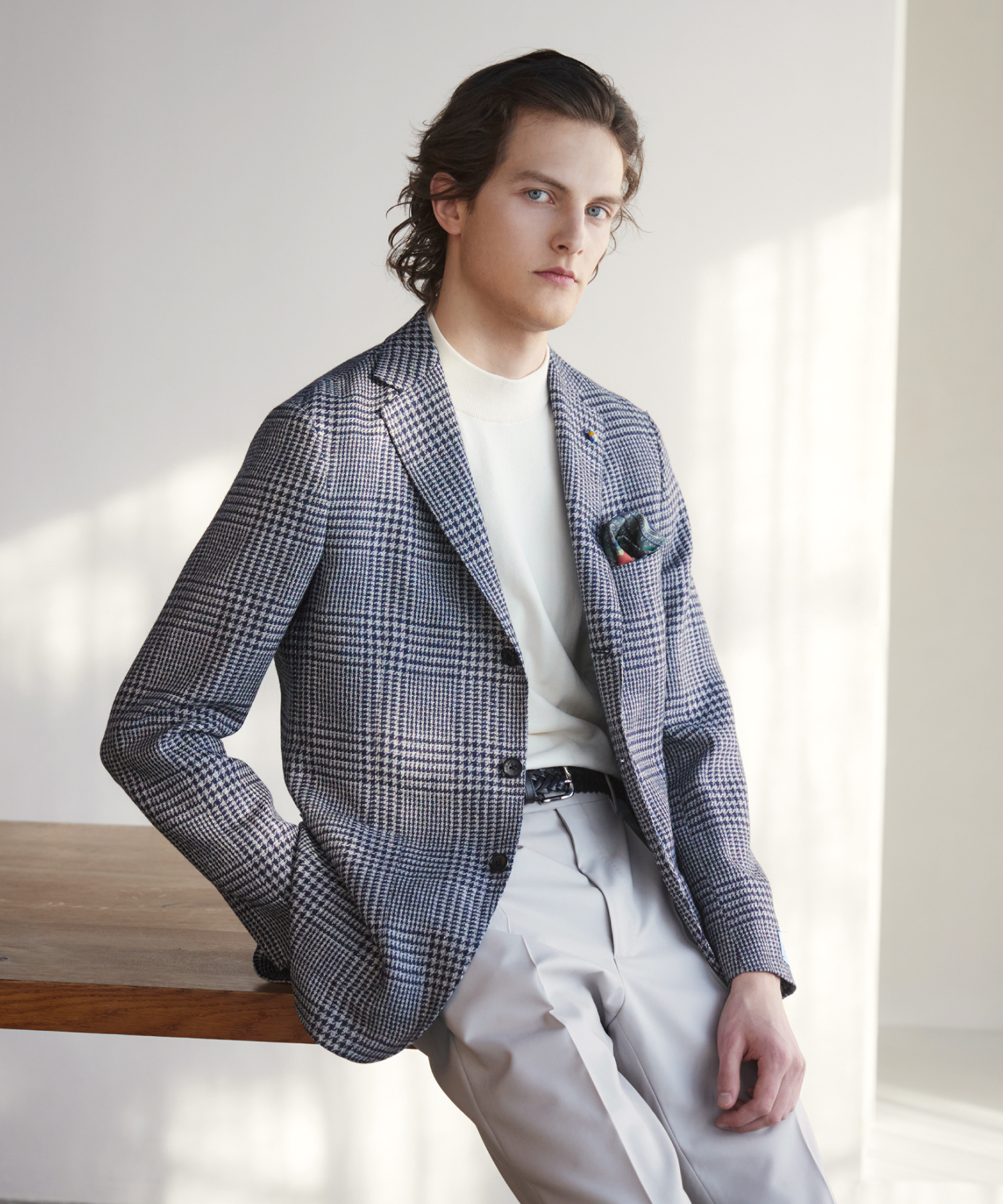 クラシックなグレンチェックジャケットに、シンプルなニットと上品なスラックスを合わせたスタイル。ジャケットはウール、リネン、シルクの3種類の糸を混紡して作られており、エレガントでありながらも清涼感を備えている。