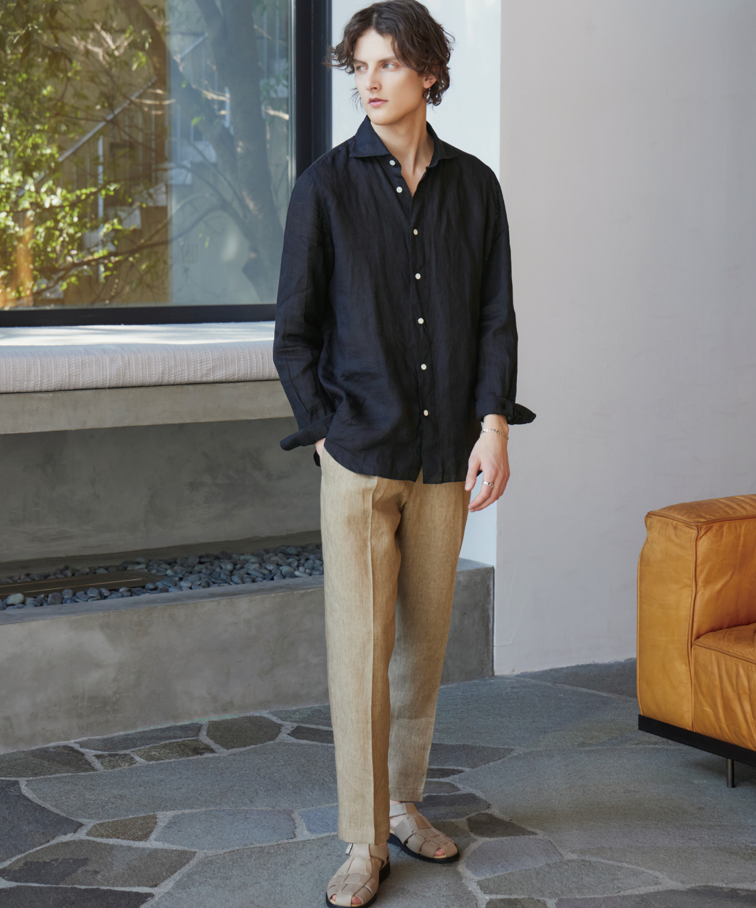 上下で軽やかなリネンを組み合わせたリラックス感溢れる上品な装い。ナチュラルカラーをべースに、ブラックやシルバーを取り入れることで、全体をシックにまとめている。