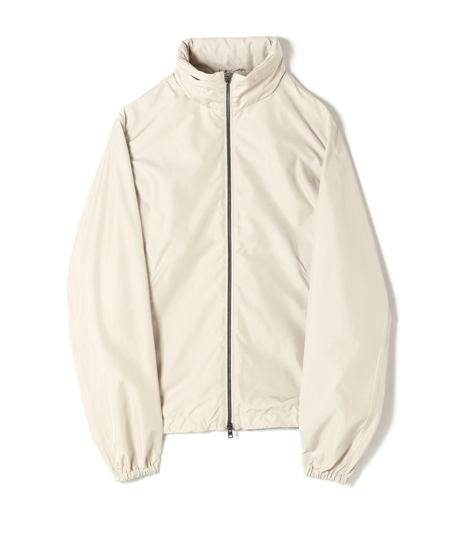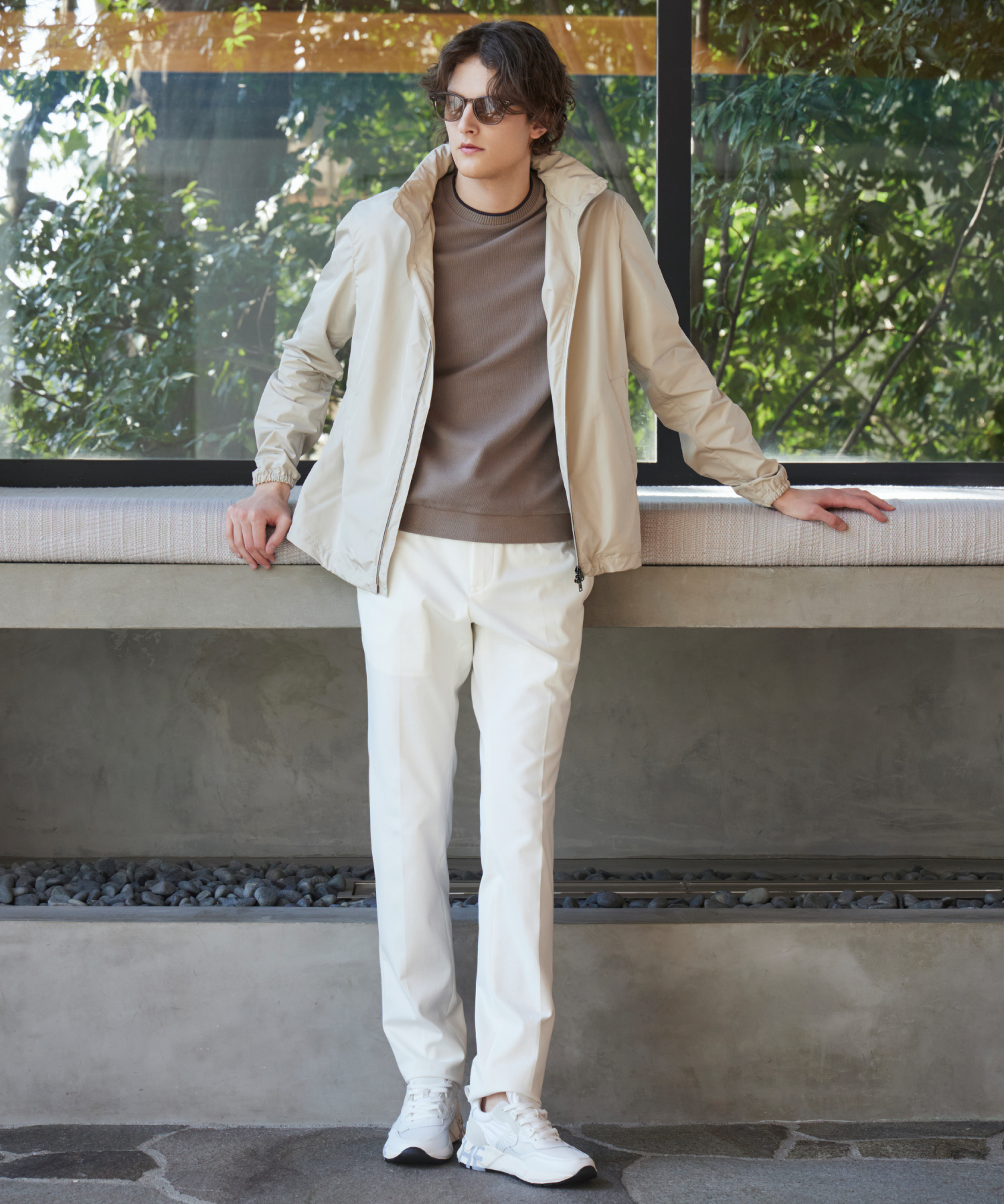 ベージュとホワイトを組み合わせた、ナチュラルなカラーリング。軽やかなブルゾンと上質なニットのレイヤードが、都会的なスポーティエレガンスを体現し、抜け感のある大人のスタイルを完成させる。