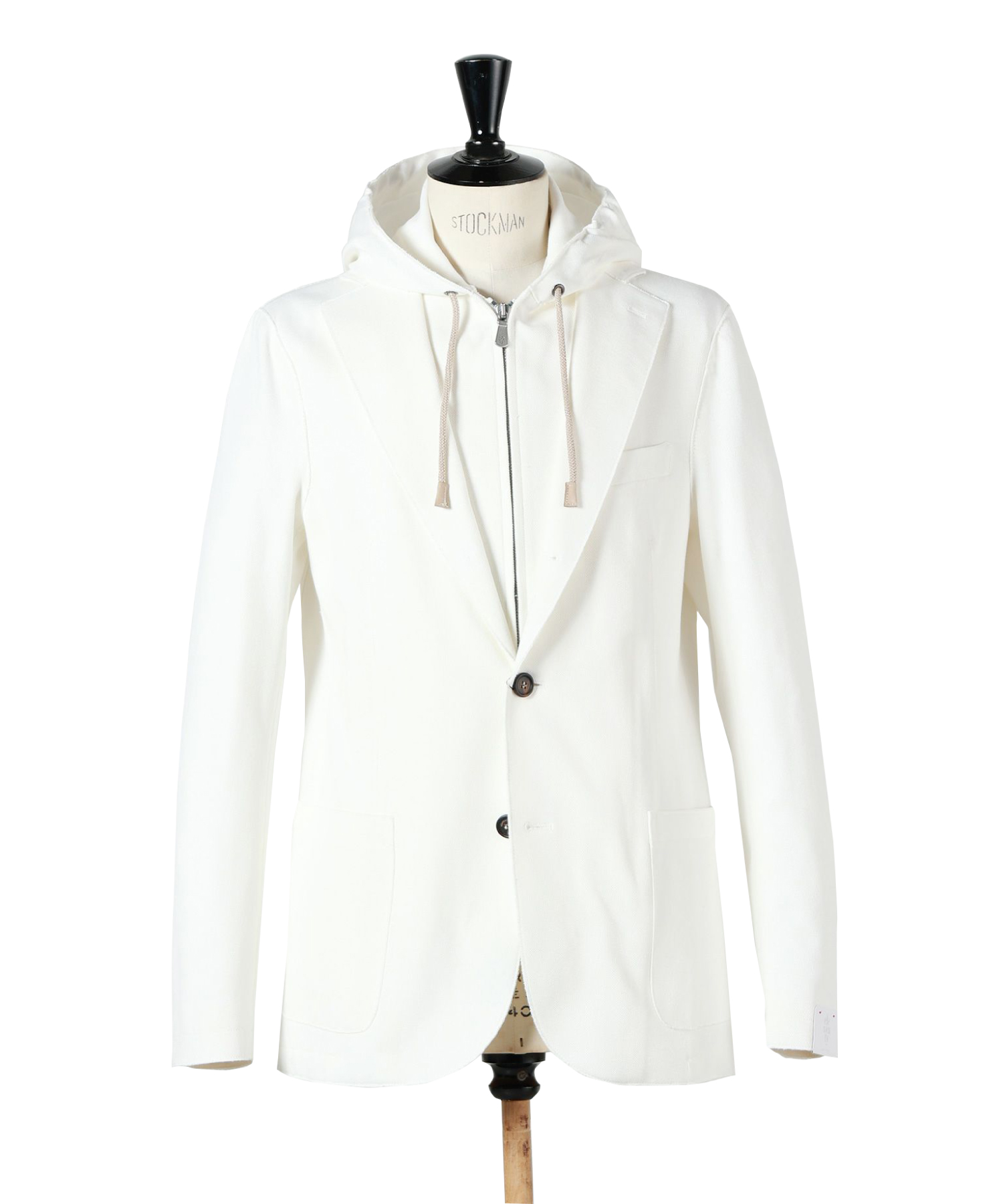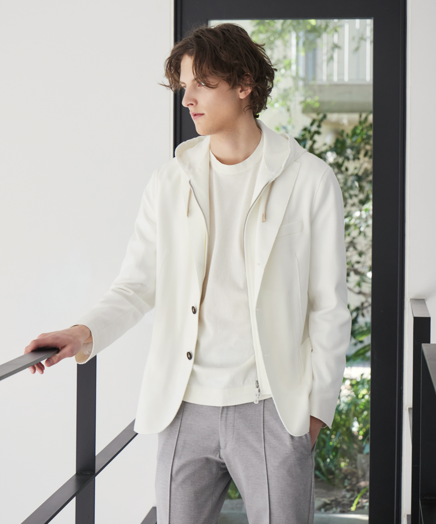 洗練されたホワイトトーンのレイヤードが生み出す、スポーティかつエレガントな装い。テーラードジャケットとフーディの組み合わせが、軽快さと上品さを両立し、都会的なリラックススタイルを演出している。