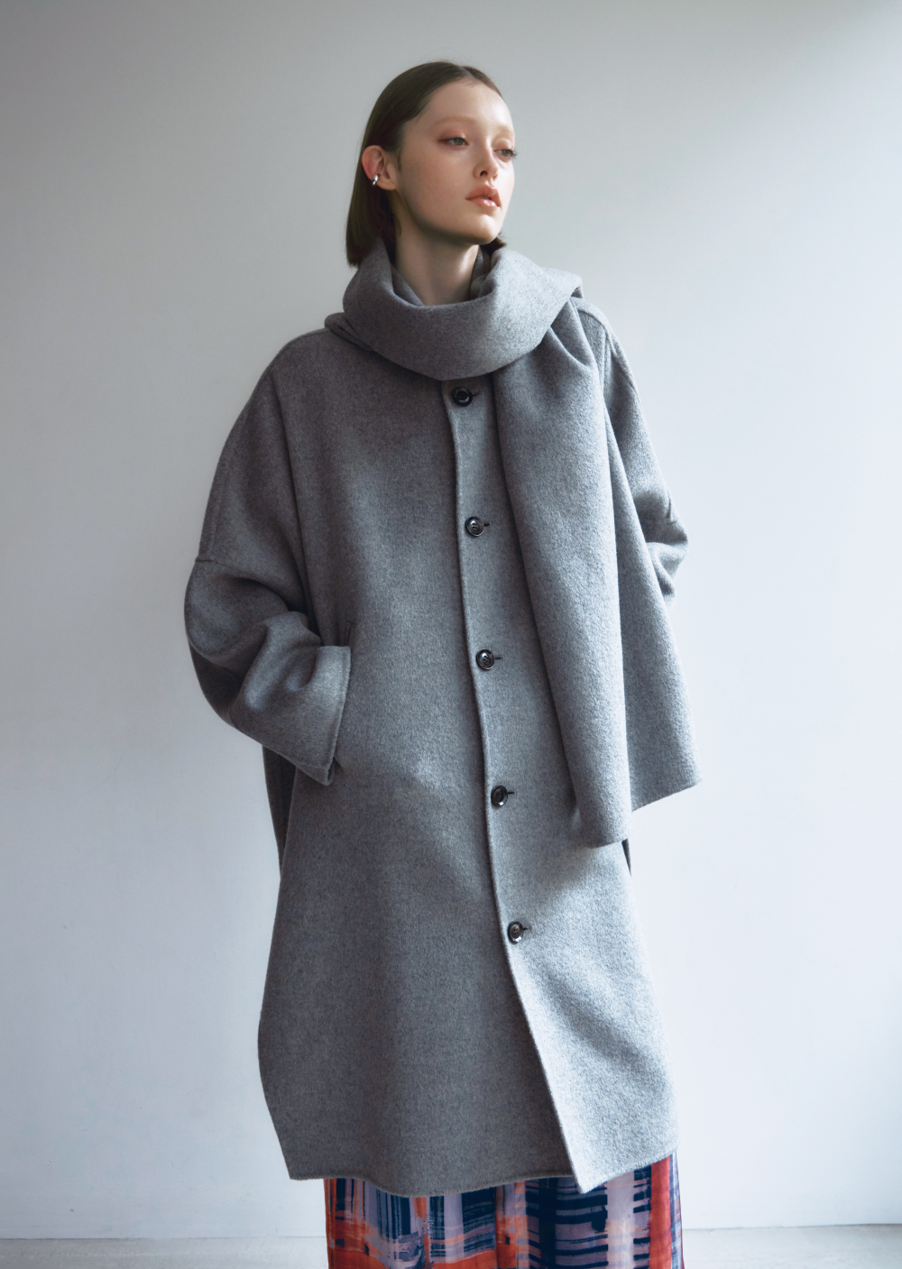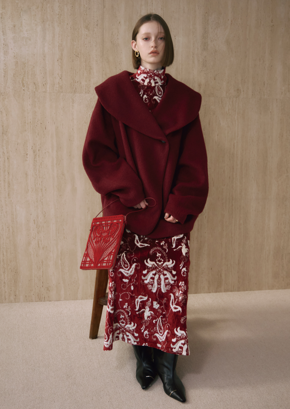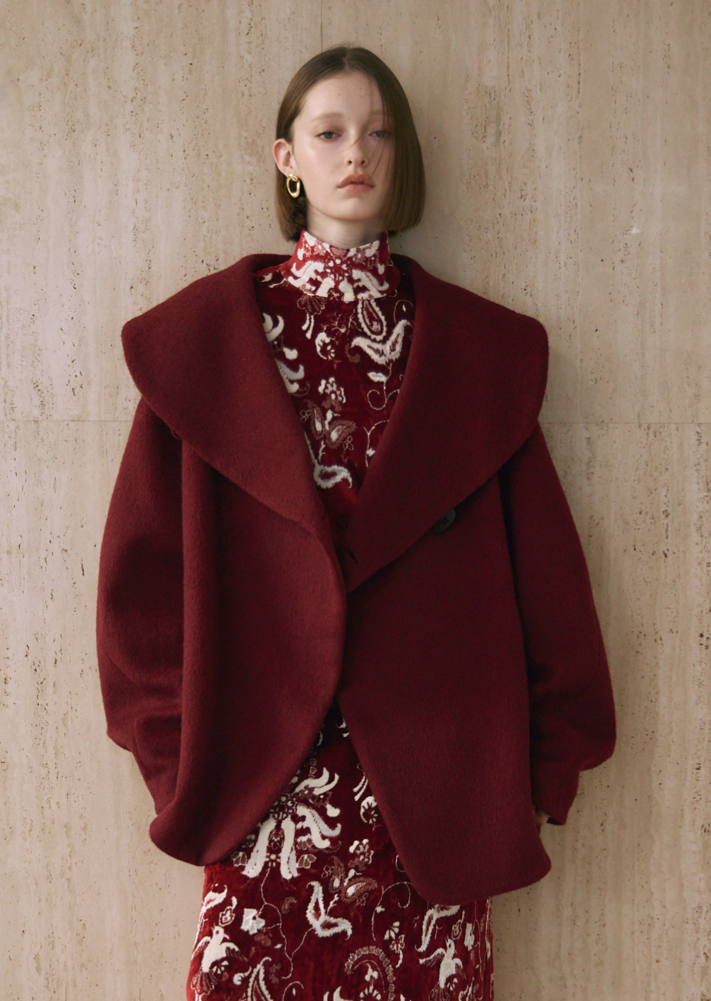 テーマである“かたち”を象徴する、フォルムがコンセプチュアルな印象のショートコート。アルパカとモヘア混紡の光沢のある糸が、華やかな柄にも負けない存在感を放つ。