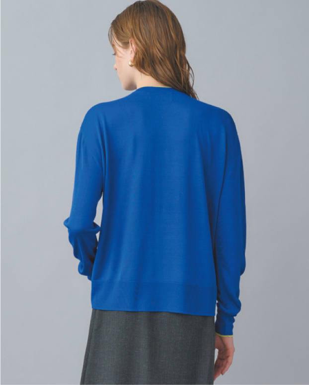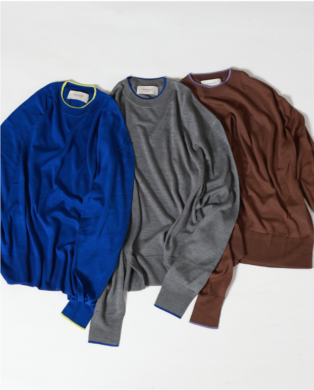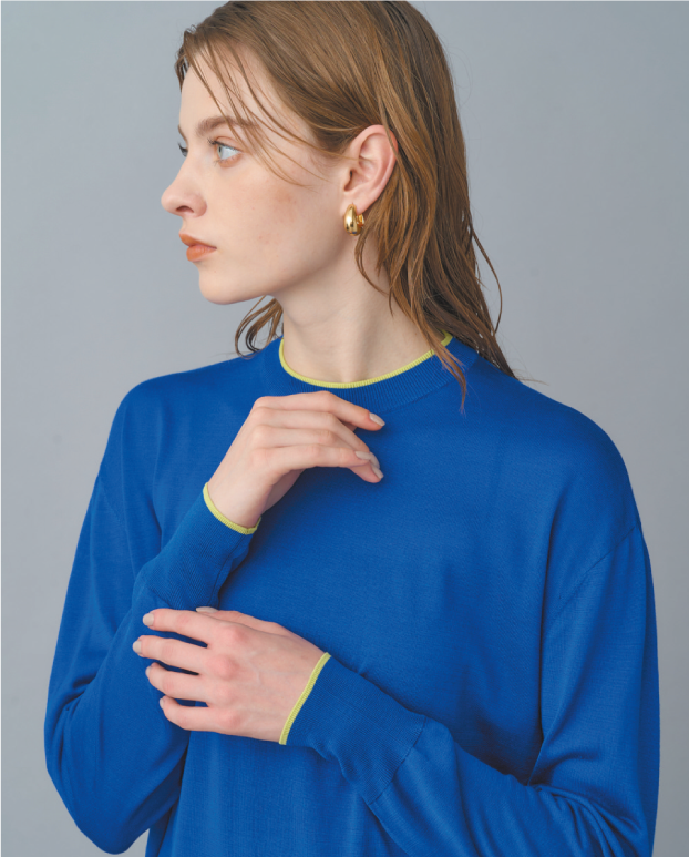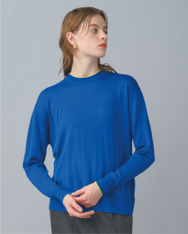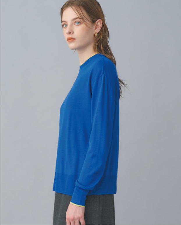 シルク特有の通気性と保温性に優れ、上品な光沢と滑らかな肌触りを兼ね備えたクルーネックニット。襟ぐりと袖口へあしらった配色ラインがさりげないアクセントに。アームや身頃はゆとりがありつつ、アウターを羽織ってももたつかないすっきりしたプロポーションもポイント。上質なシルク素材でありながらウォッシャブル可能なイージーケアを叶えてくれ、オンオフ様々なシーンで活躍する汎用性の高い一枚。