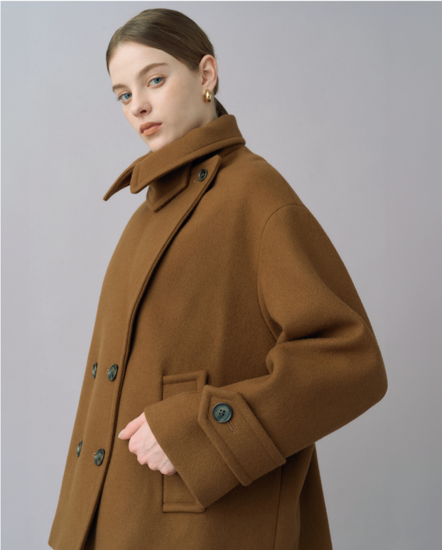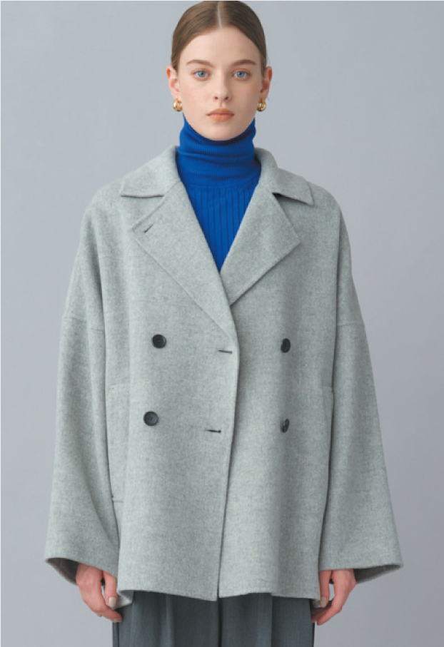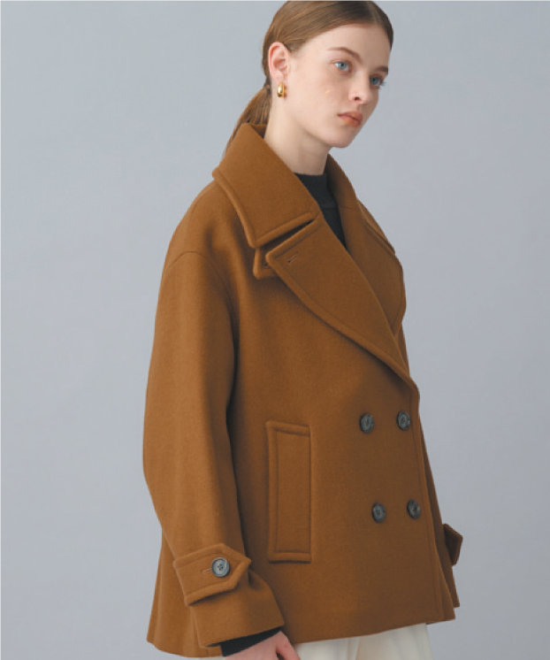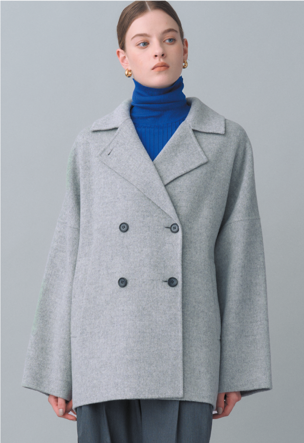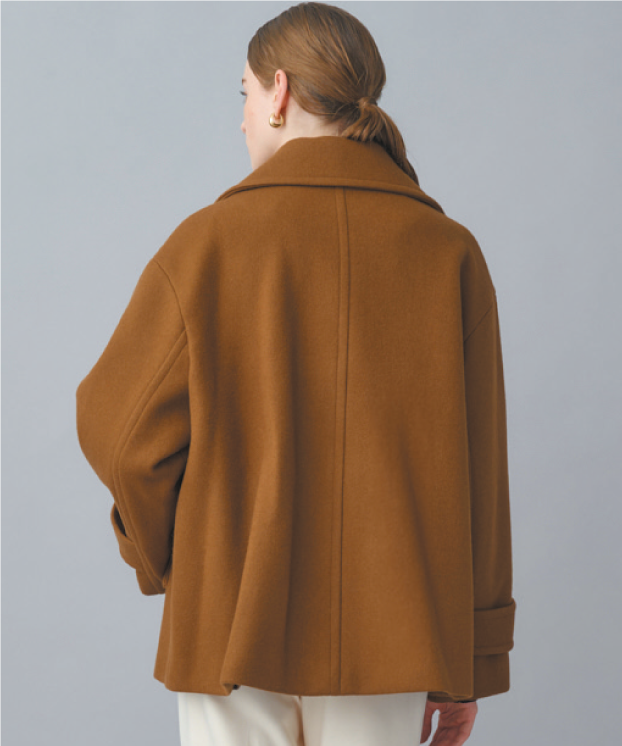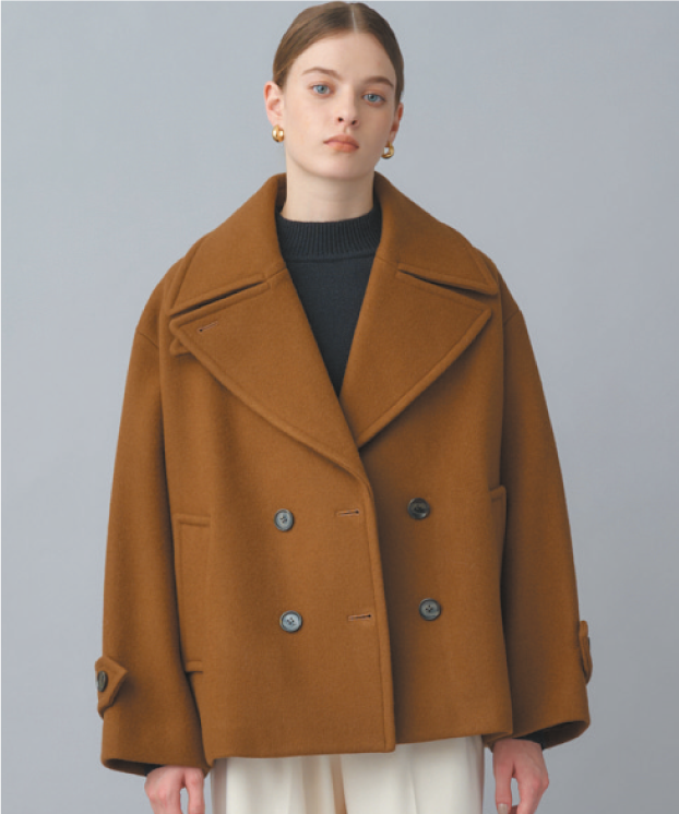 Super120's ハードプレスメルトンの上質なウール素材を使用した、オーバーサイズのダブルブレストショートコート。チンストラップ付きの襟はきちんと留めても、襟を開いてPコート風の着こなしにしても異なる表情を見せてくれる。凛とした佇まいでありつつ、様々なアレンジを自在に楽しめるユニークなデザイン。