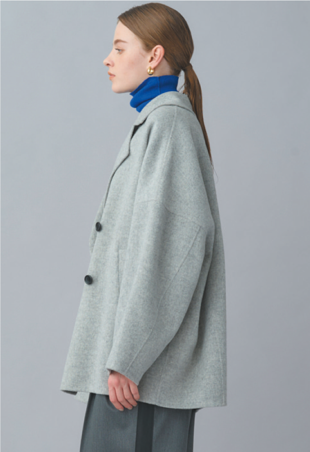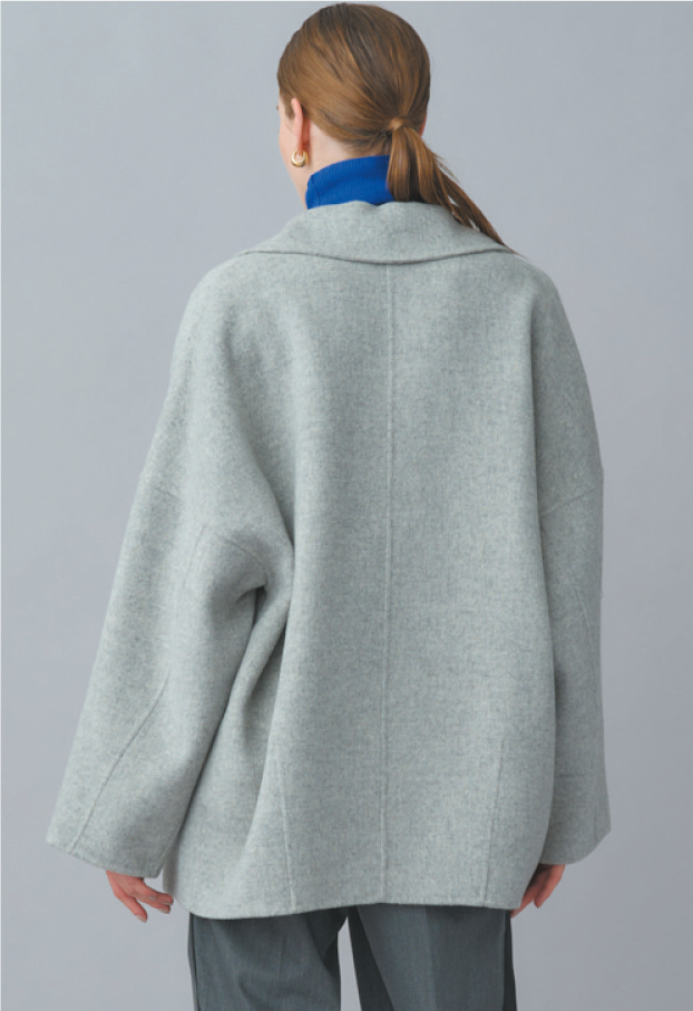 ラムウールのSuper120's原料を使用したダブルビーバー素材のハーフ丈コート。スーパーシャルム加工という、丁寧に時間をかけて起毛するこだわりの工程を裏表両面に施して、ツヤ感や手触り、ドレープ性を引き出す。ゆったりとリラクシーなシルエットで、厚手ニットを着込んでもボリュームが出過ぎずすっきりと見せてくれる。