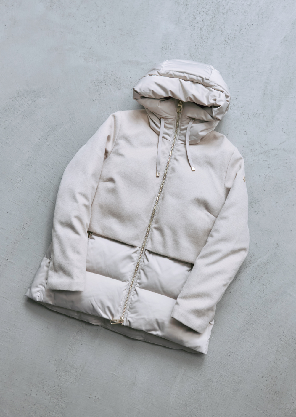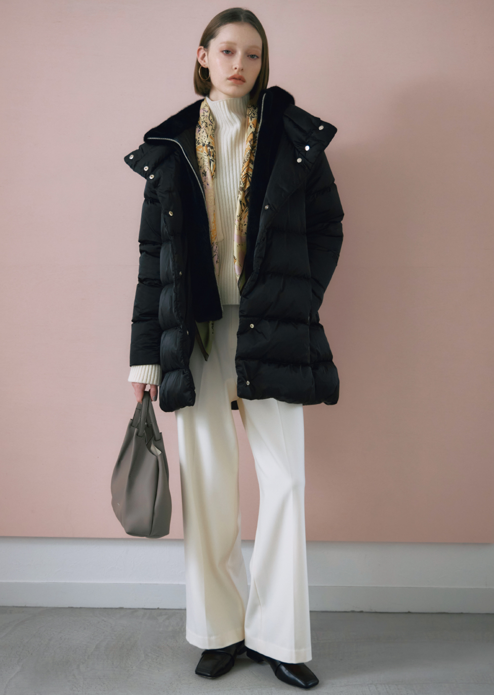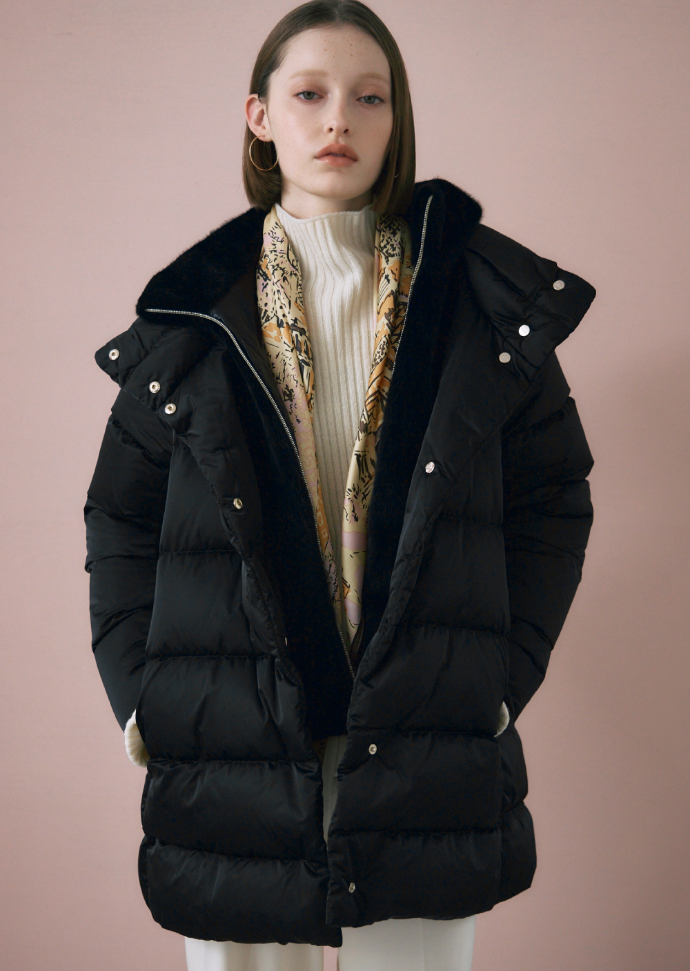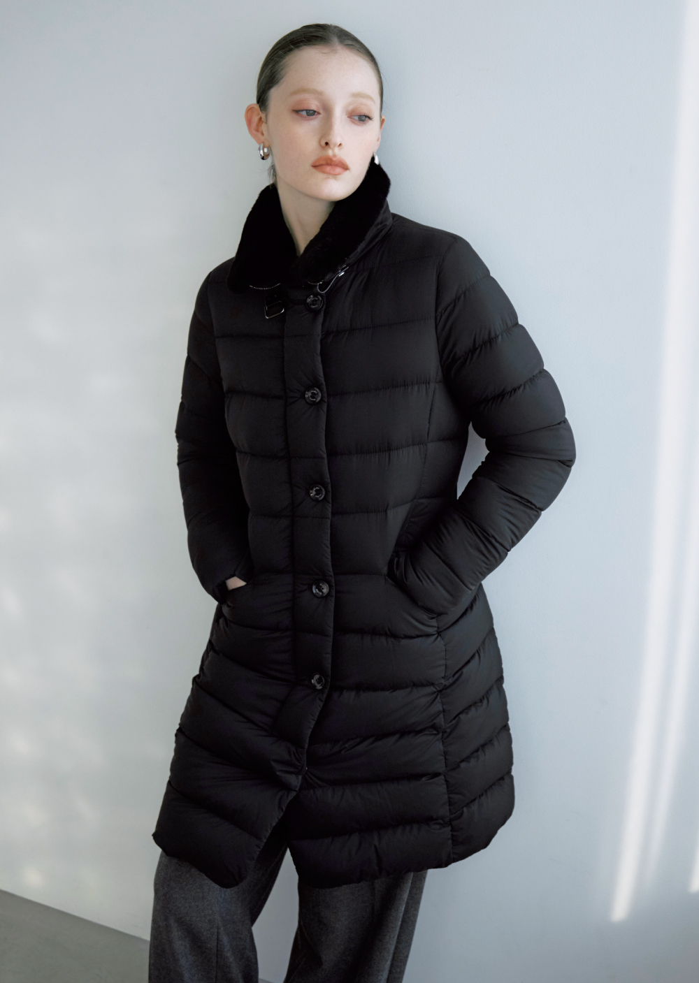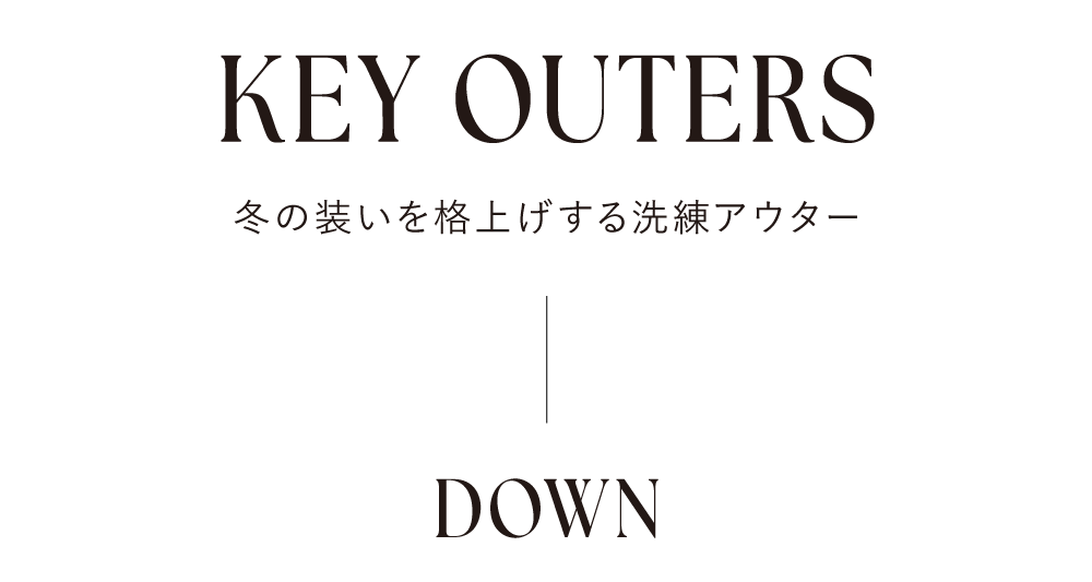 シンプルなワントーンのスタリングにはハイクオリティな機能性素材とミンク調の上品なエコファーを共存させたダウンコートで、クラス感を漂わせて。