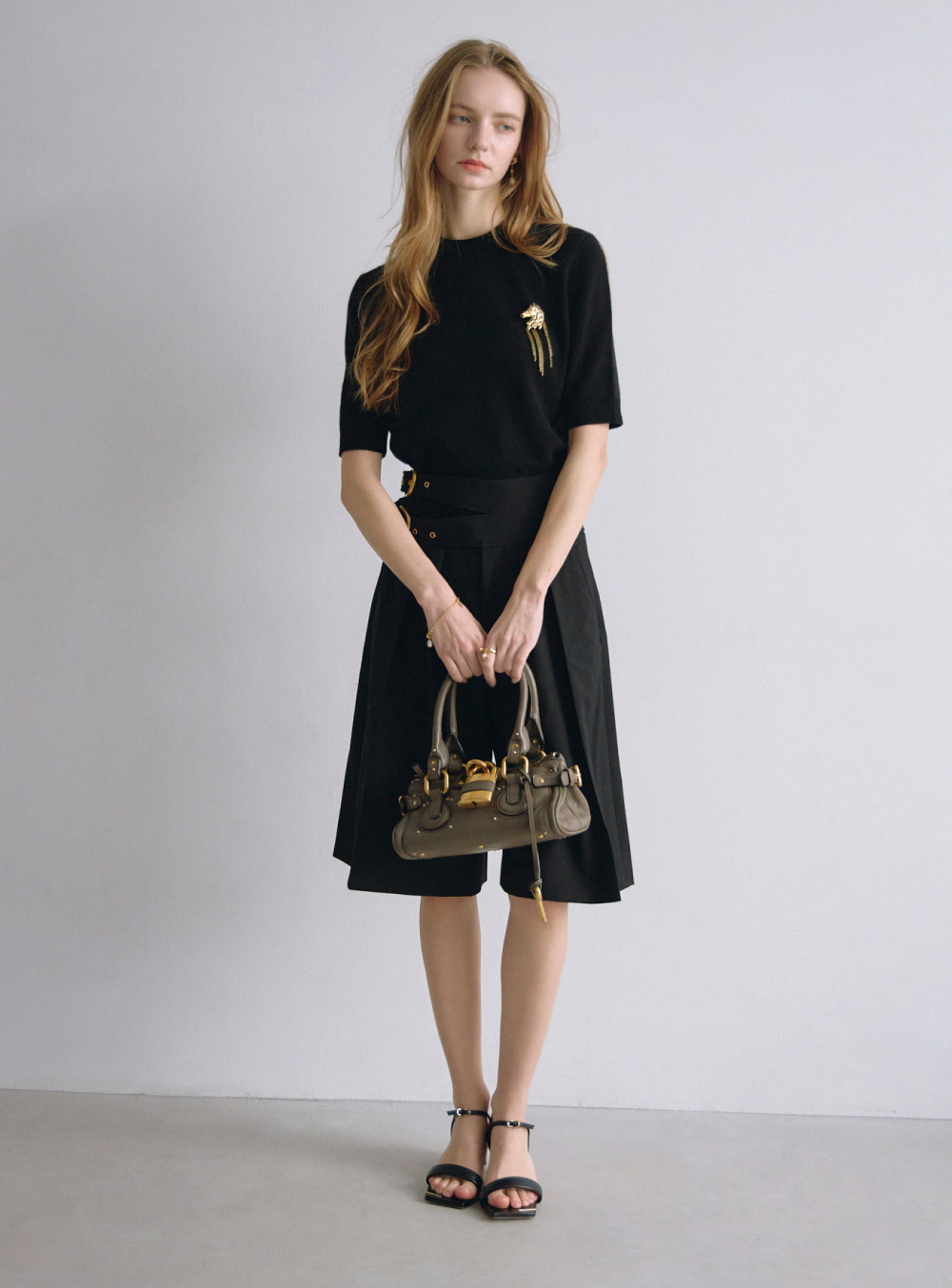 ゴールドトーンのホースモチーフやダブルバックルをアクセントに洗練されたモードスタイル。