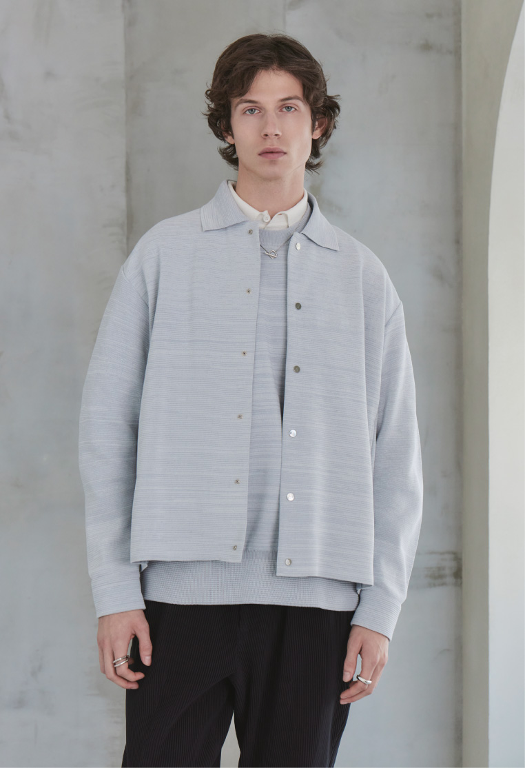 CFCLを代表する「MILAN」シリーズによるアンサンブル。爽やかなグレートーンにシルバースナップが映える仕立て。3Dニッティングによる立体感が軽やかに身体を包み込む。