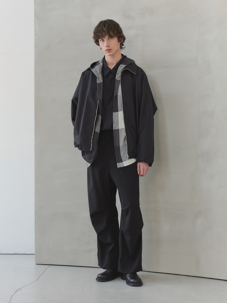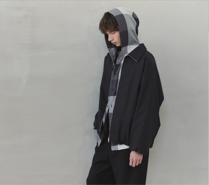 ブランドを象徴するフードシャツを大胆なチェックで刷新。落ち着いたトーンの中に奥行きを与え、全体を引き締めながらさりげない個性を添えるスタイリング。