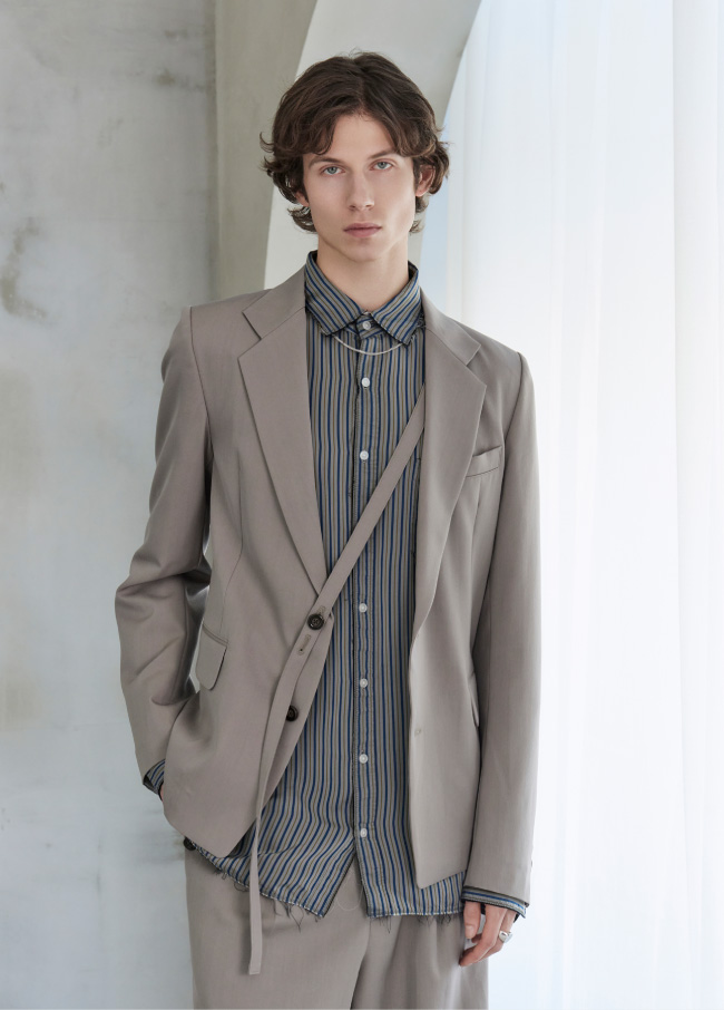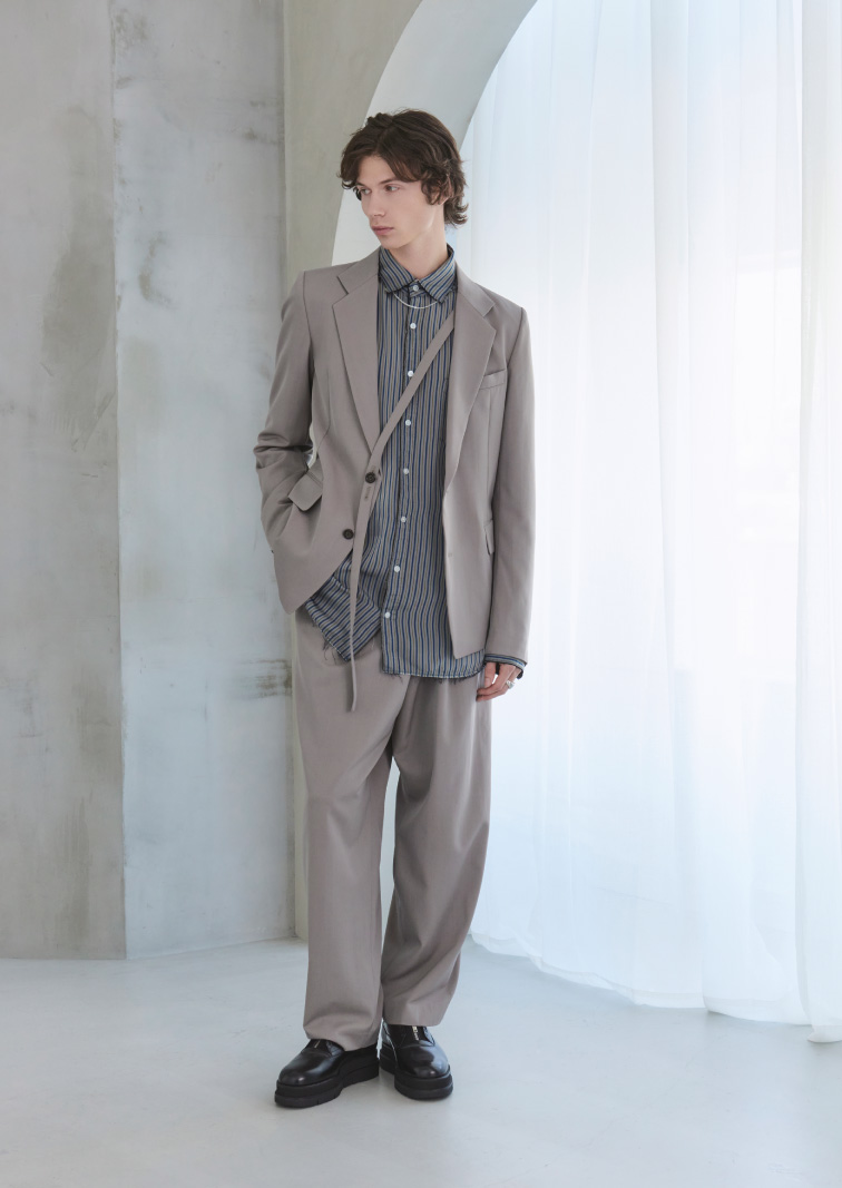 〈ウジョー〉が提案するセットアップスタイル。上品な素材感と色味に調和するストライプシャツを合わせ、柔らかく春らしい印象に。ストラップを留めることで装いに変化を与える。