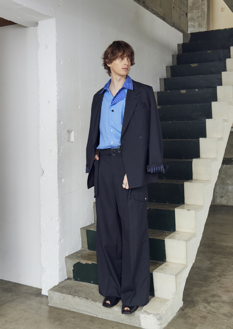 〈タム〉の“OXFORD SHIRT”を軸にしたモードスタイル。レイヤードされた襟元がシャツに奥行きを生み、存在感を放つ。鮮やかなブルーが視線を引き寄せ、静かな強さを宿したシャツスタイルを形づくる。