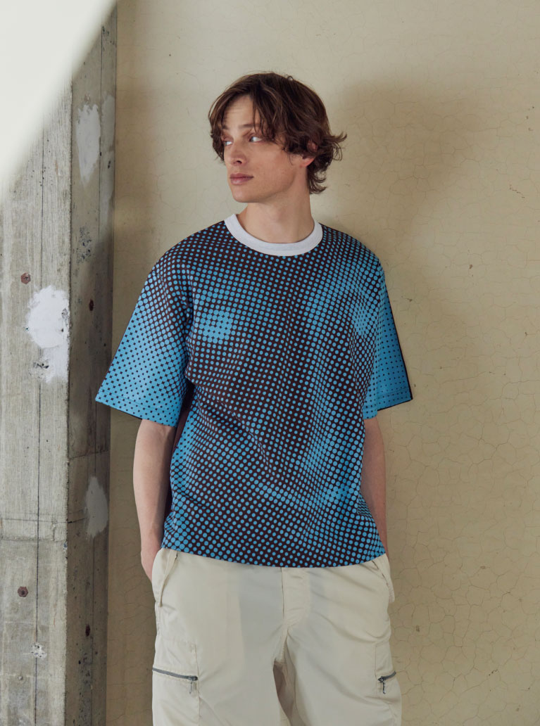無数のドットで人物の顔を浮かび上がらせるグラフィカルなプリントが、視線を引き寄せる1枚。