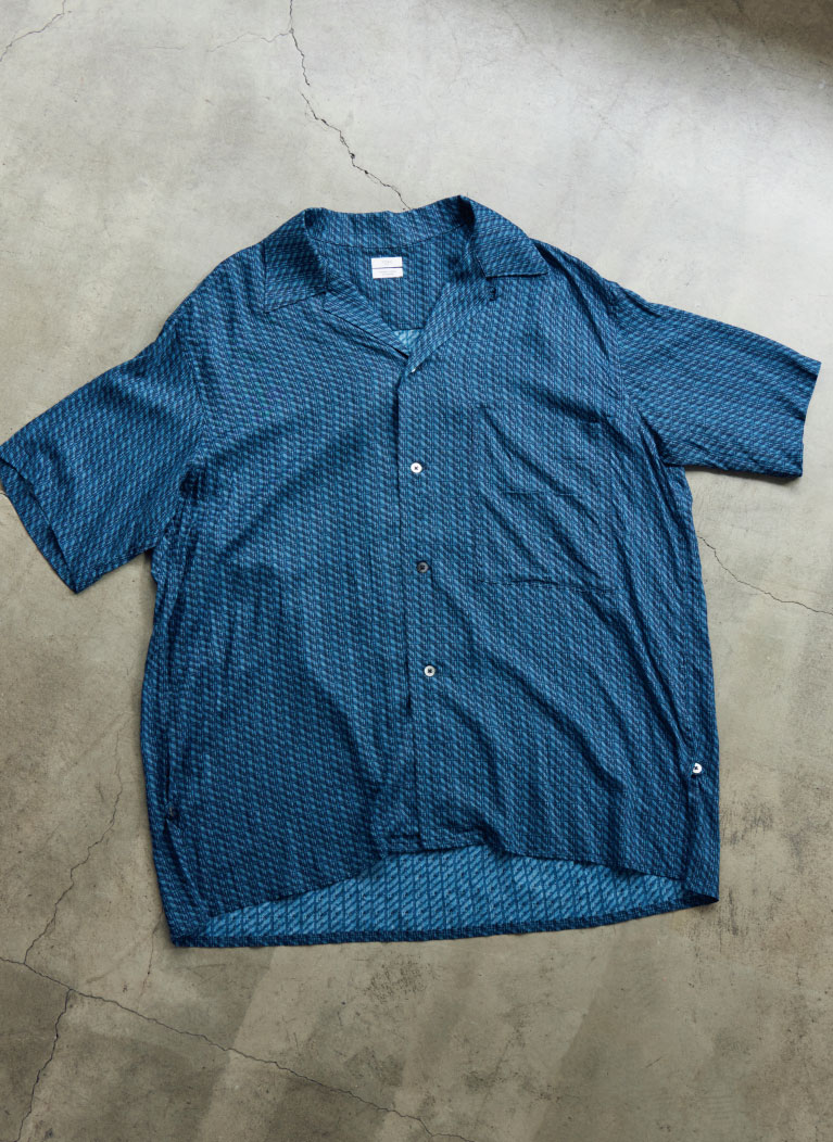 オリジナルの柄を全面に配したシャツは、落ち着いたカラーリングでスタイルに取り入れやすい。