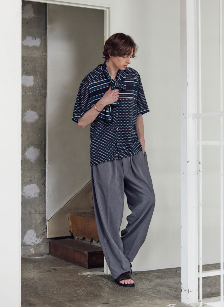 〈レインメーカー〉のシャツを使用したスタイリング。七宝文様から着想を得たドット柄が、抑えたトーンの配色の中に静かな個性を添える。同柄のストールを首元に添えることで、シンプルな装いにさりげないアクセントを加えてくれる。