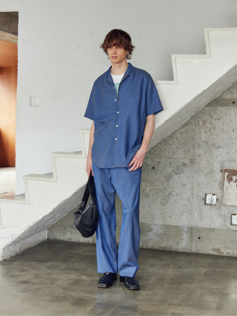 〈オーバーコート〉のシャツは、一見デニムのように見えながら、ウールを用いた特別な素材を使用。カジュアルな印象のデニムを、上品で落ち着いた表情に昇華させた。
