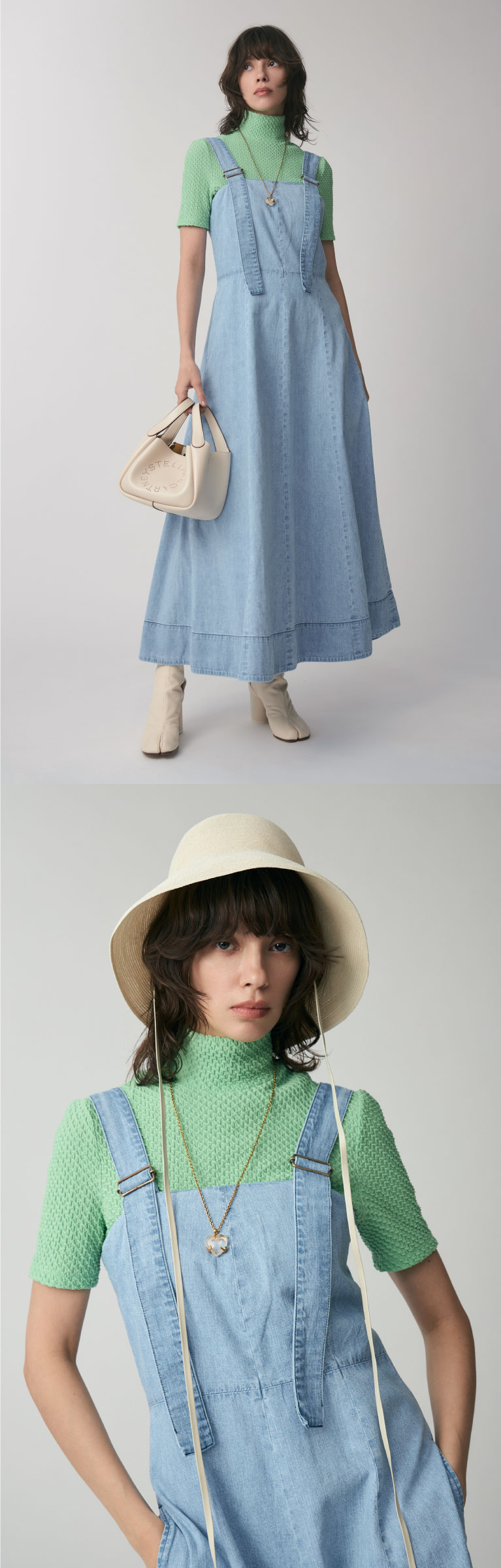 胸元のロングストラップベルトが印象的なデニムワンピース。淡く涼しげな印象になるまでブリーチを施した、こだわりのカラー。たっぷりと生地を使い、裾は軽やかになびく。小物は白でまとめて、春夏らしいクリーンな装いに。