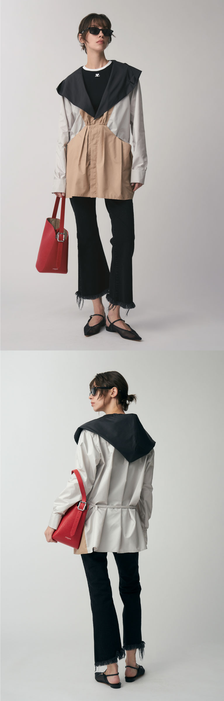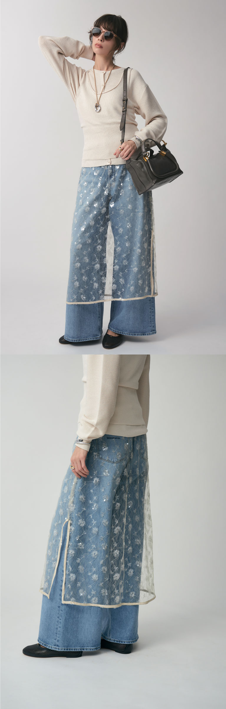 太目のワイドストレートで、腰についた尾錠でウエストを調整することができる“ザ オリヴィア”。アウトでもインでも着用できるパンツ。ウォッシュを効かせた美しい色合いが、繊細なゴールドのメッシュ生地と絶妙にマッチする。