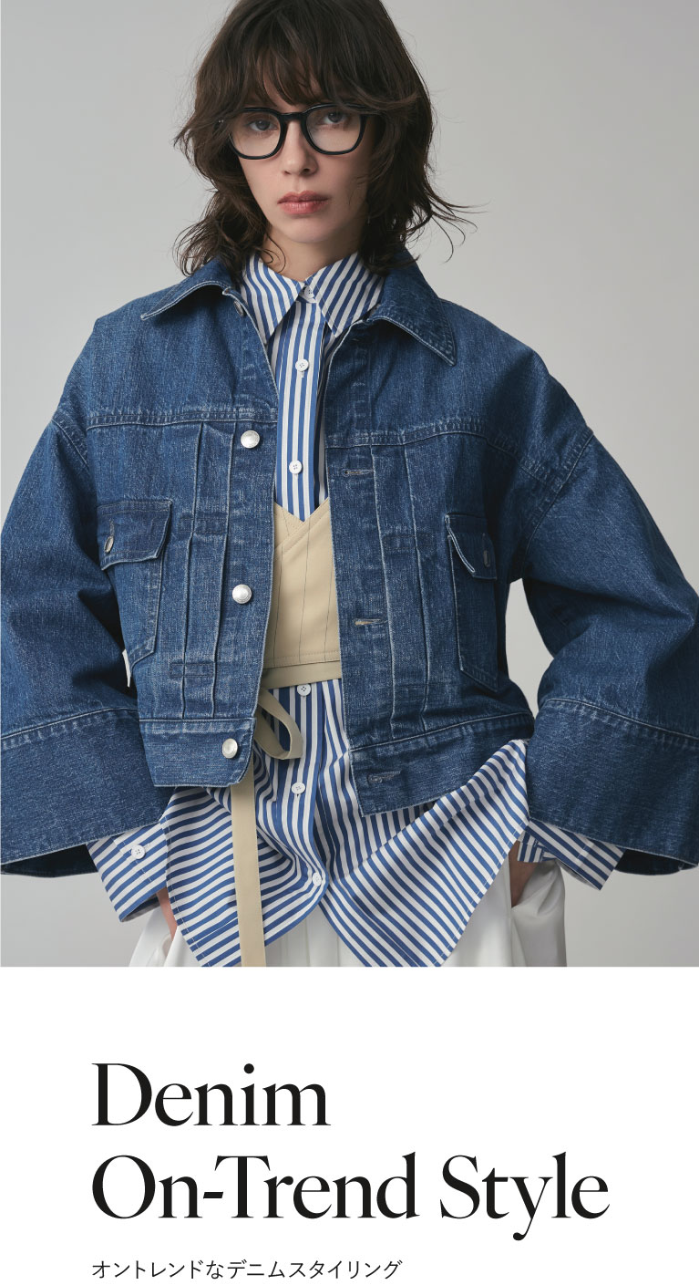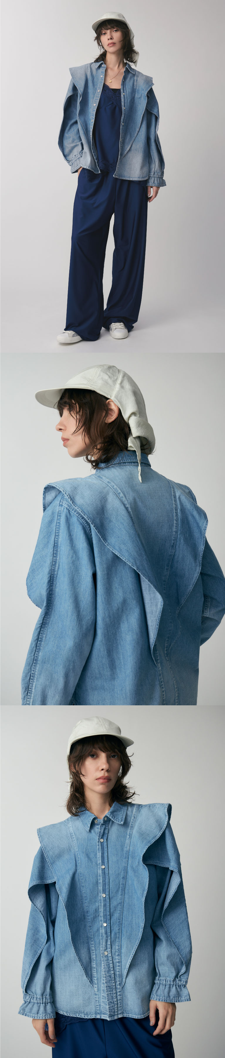 〈ジャパンデニム〉と〈ニアーニッポン〉の今季のコラボレーションは、フリルをあしらったウエスタン仕様のシャツ。デニムらしい擦り加工で甘さを抑えカジュアルダウン。レースキャミに羽織ってテイストMIXもおすすめ。