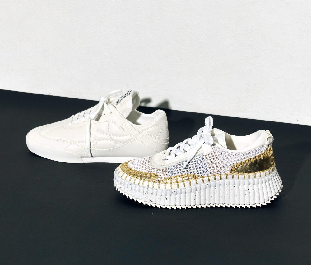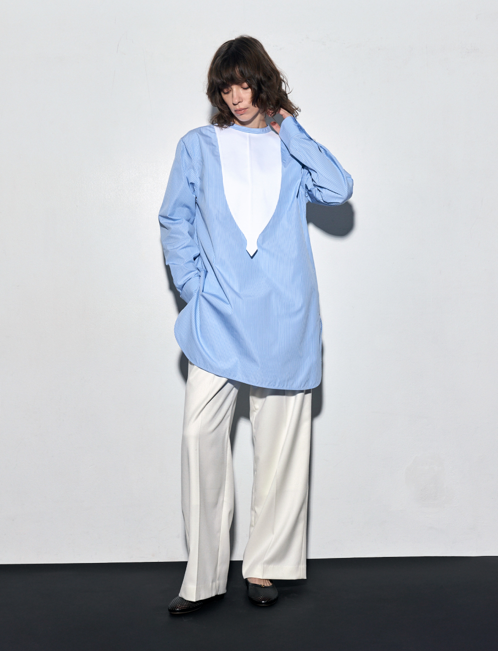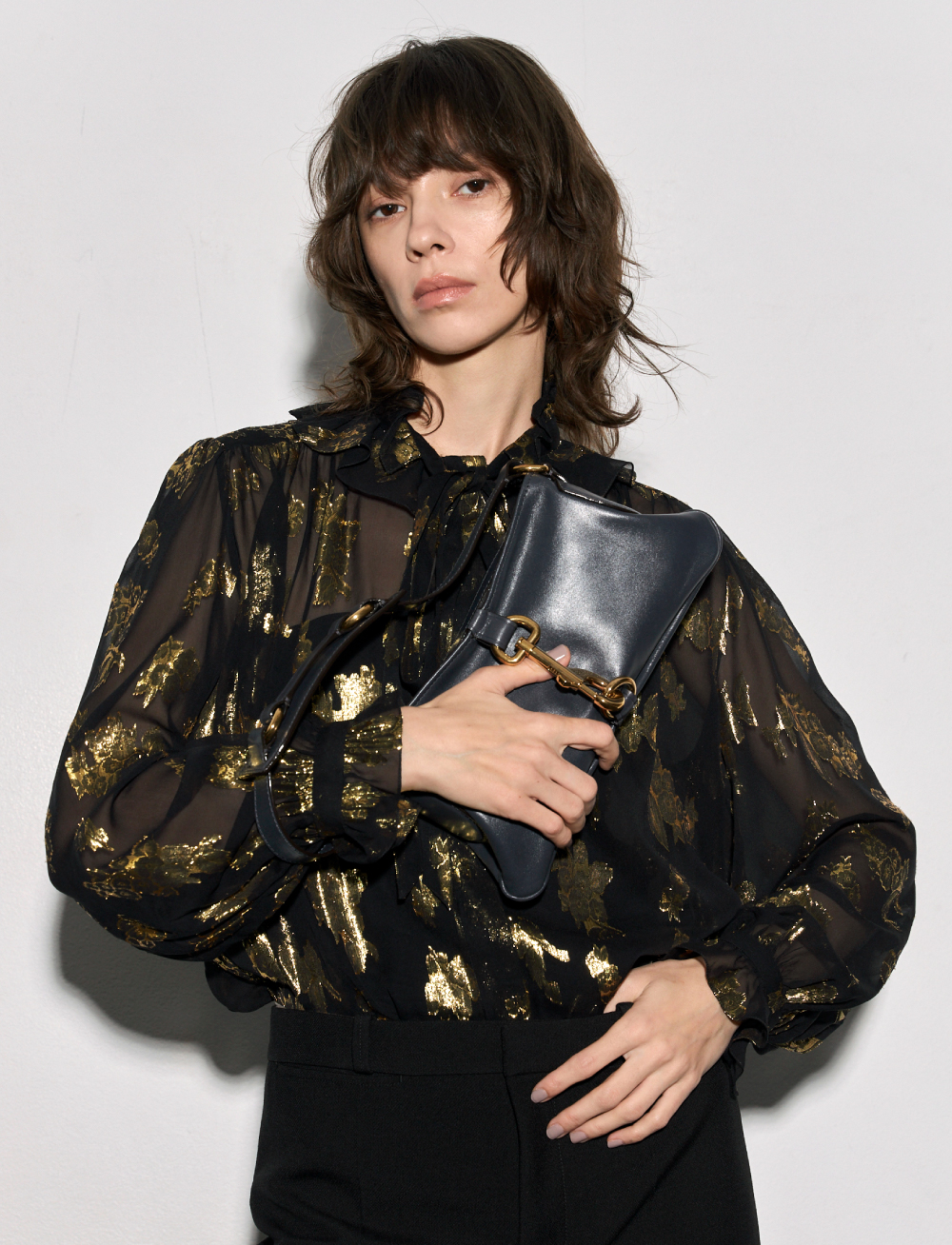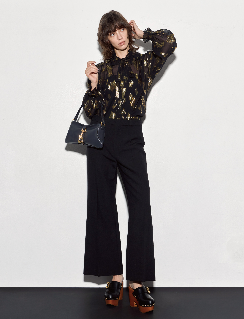 デザイナーのシェミナが提案したのは、シルクモスリンにゴールドのジャガードが施されたブラウス。上質で美しいシルエットのパンツとのスタイリングで、自由で力強い、現代の女性像を体現した。