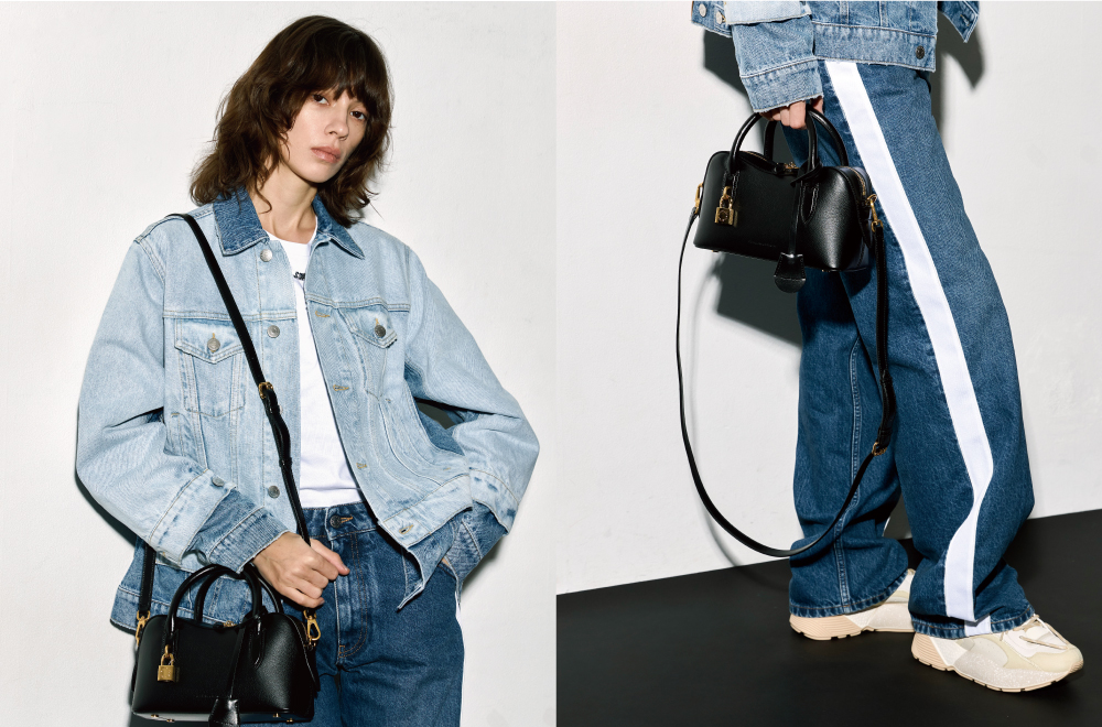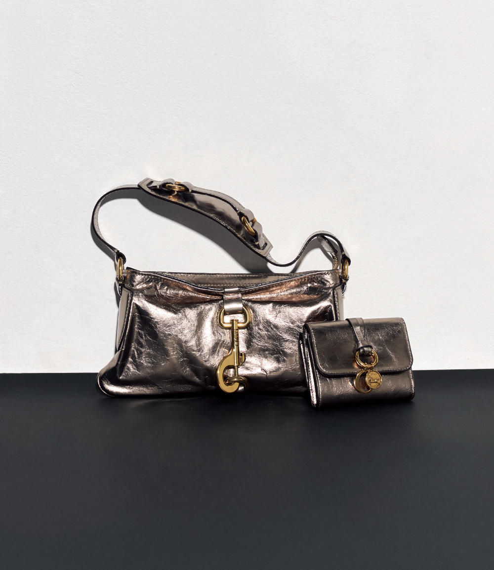 タリックグレイン加工を施した、動物性皮革に代わる贅沢なヴィーガン素材を使用したファブリックに、新たにブラックのチェーンが登場。¥52,800coming soon