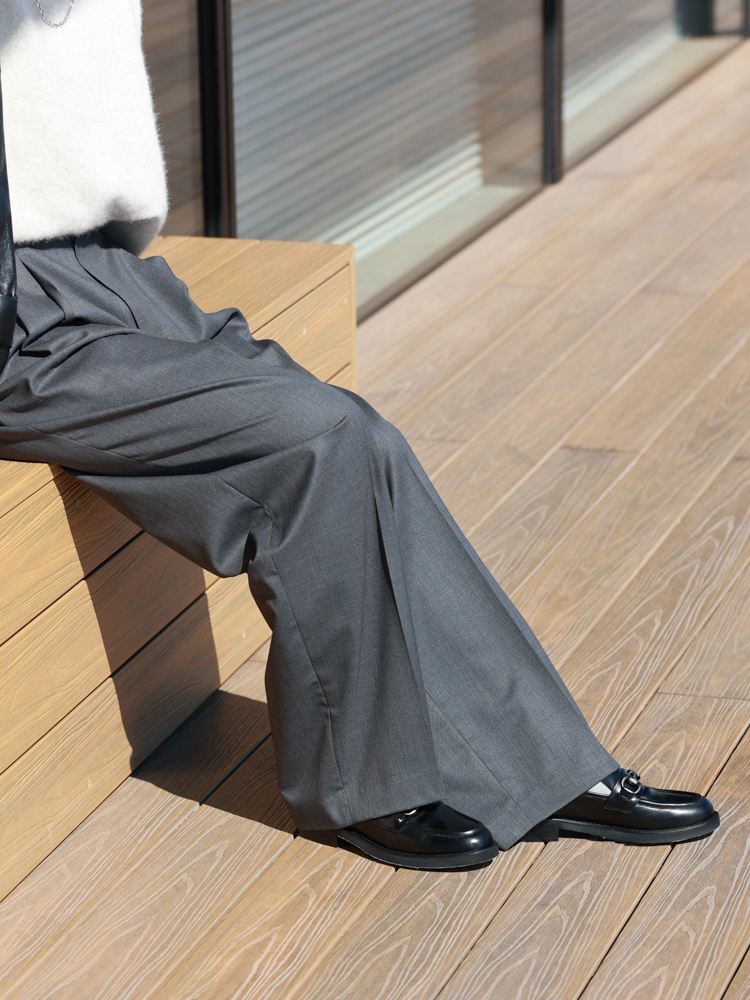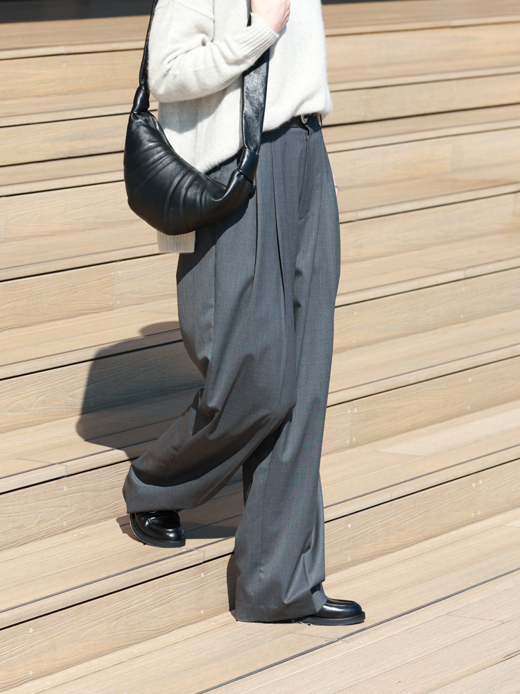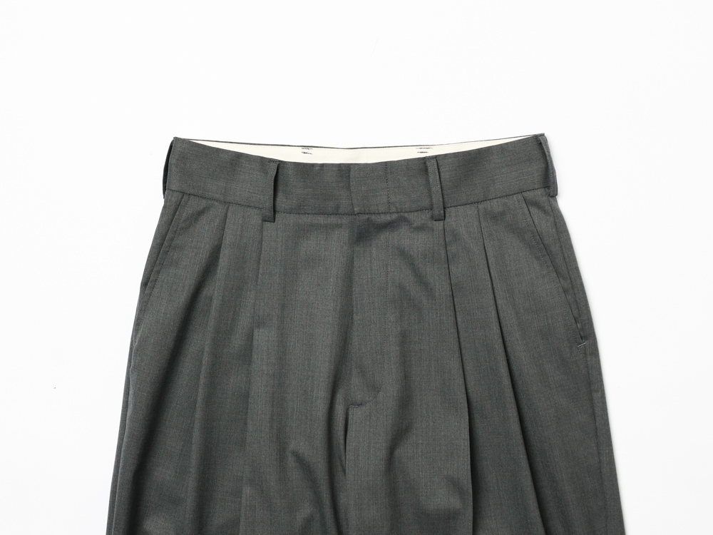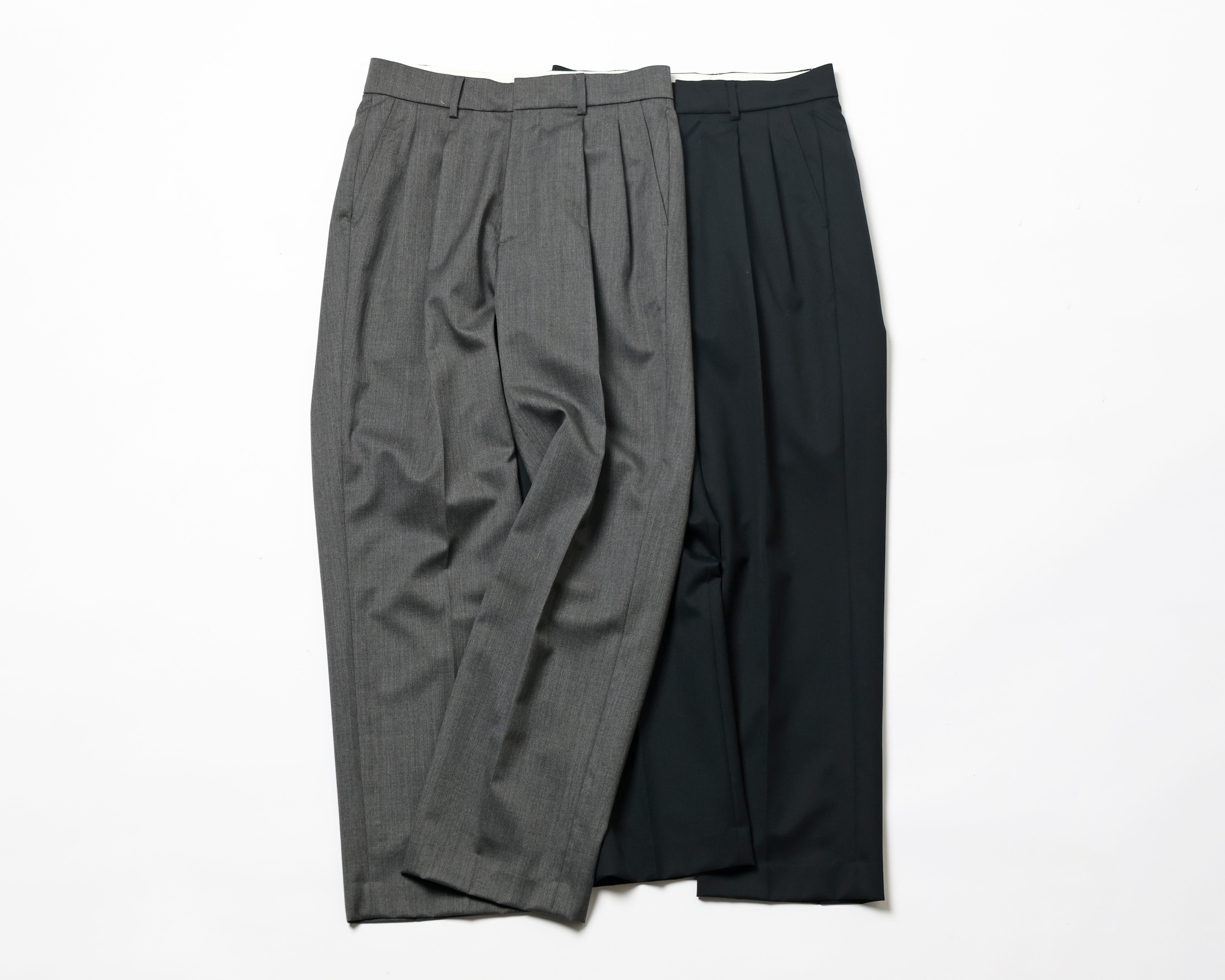 ハイウエスト×ワイドシルエットで、トレンド感とスタイルアップ効果が手に入る美シルエット。ツータックが生み出すたっぷりとしたワイドシルエットながらも、裾幅をやや細めに設定してコクーン気味のシルエットにすることで、幅広い体型の方にマッチするだけでなく、シルエットに程よいトレンド感を生んでいます。ヒップや脚の形をカバーする抜群の美しいシルエットで、履いた瞬間お客様にご満足いただける仕上がりとなっています。