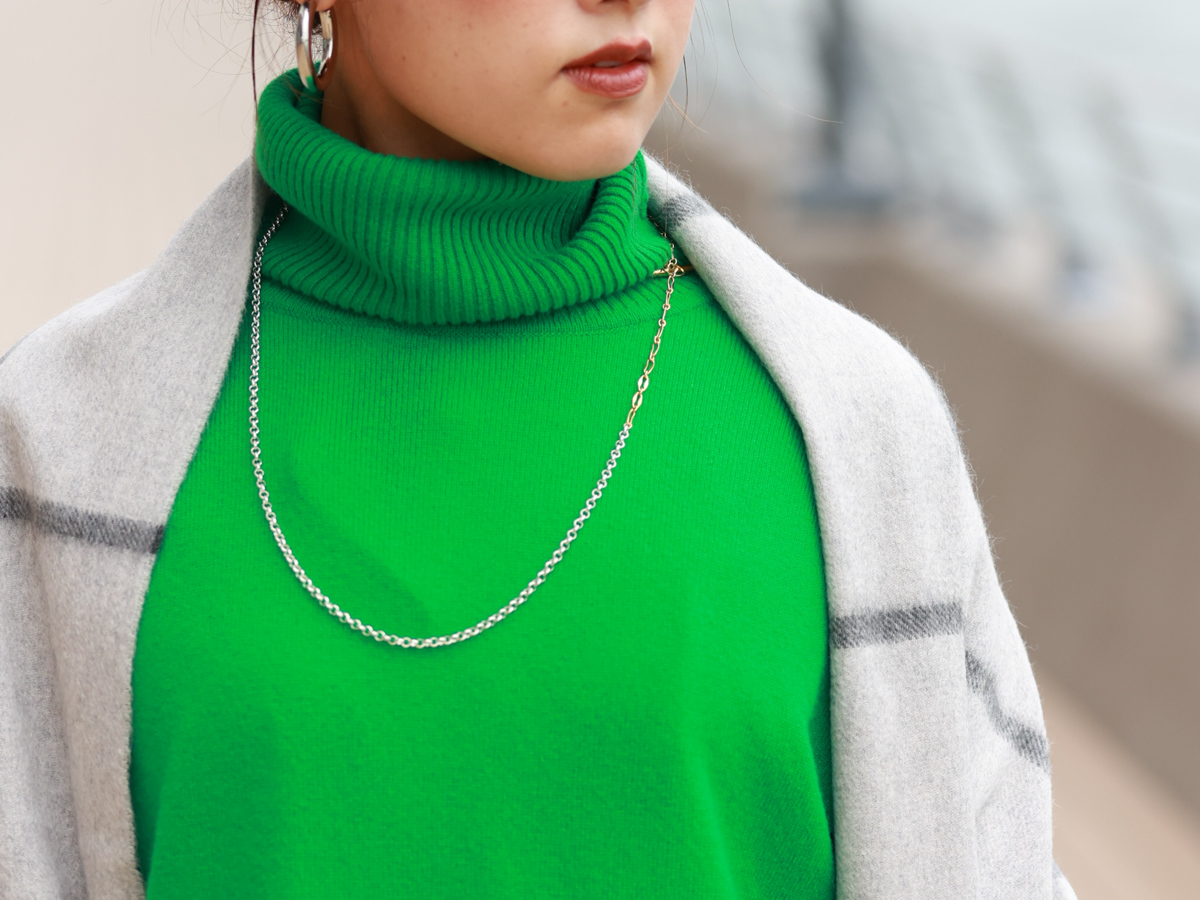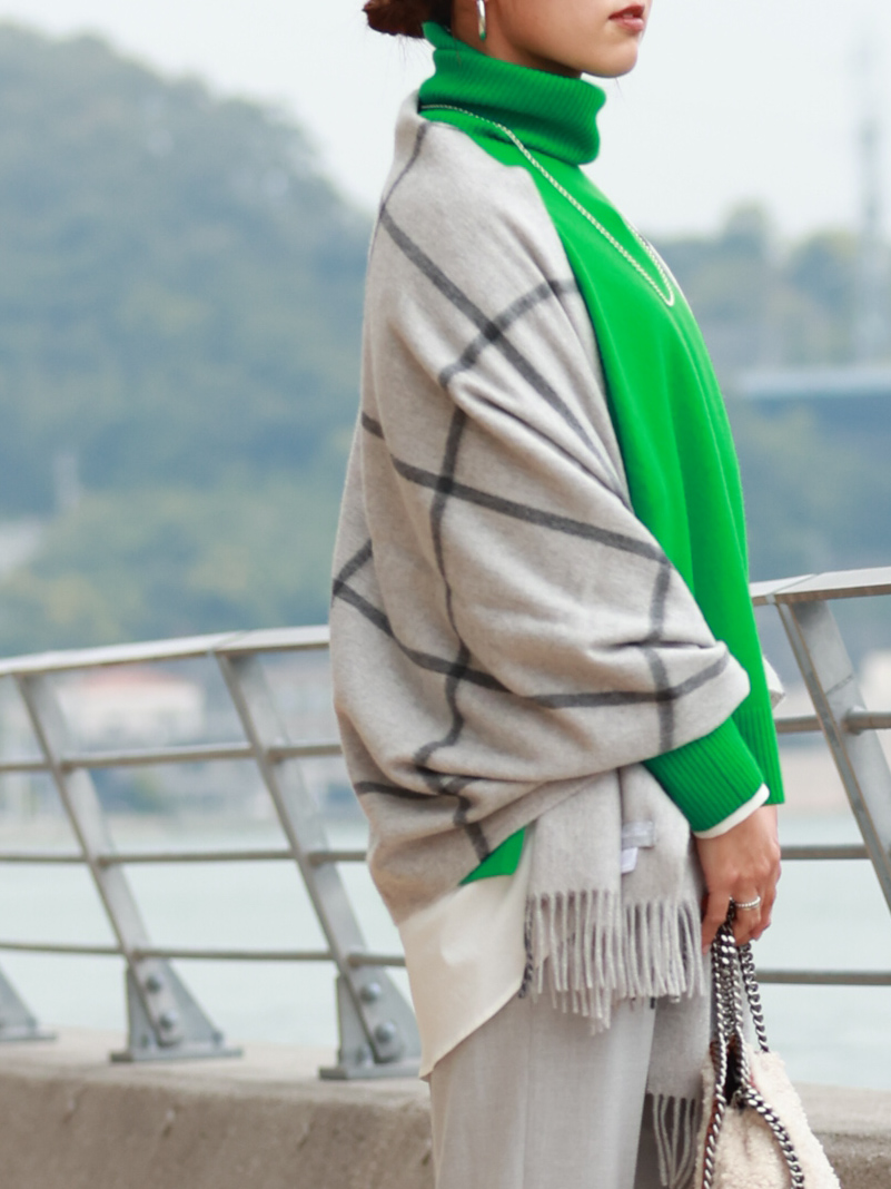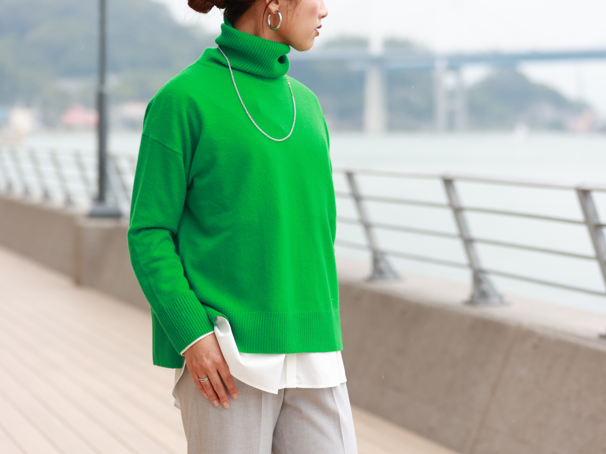 カシミヤニットの発色の良さが印象的な一着です!モノトーンカラーが好きな私には、ビビットなグリーンが差し色としてハマりました。薄手なので、コートやジャケットだけでなく、シャツやワンピースのインナーとしても着用して、コーディネートの幅を楽しみたいです。