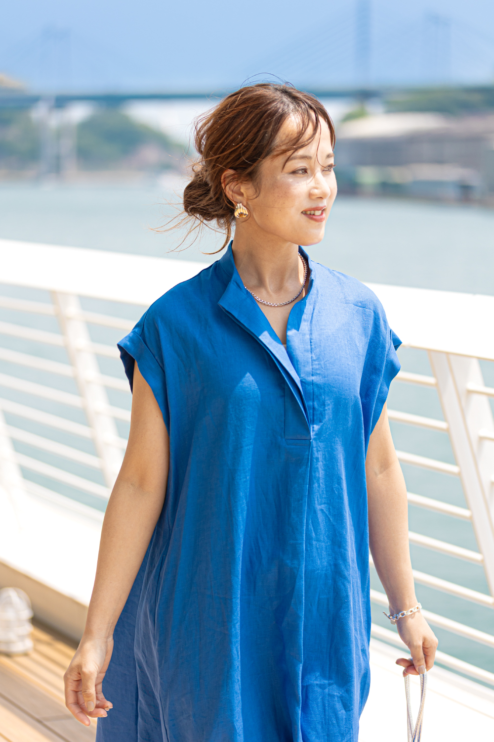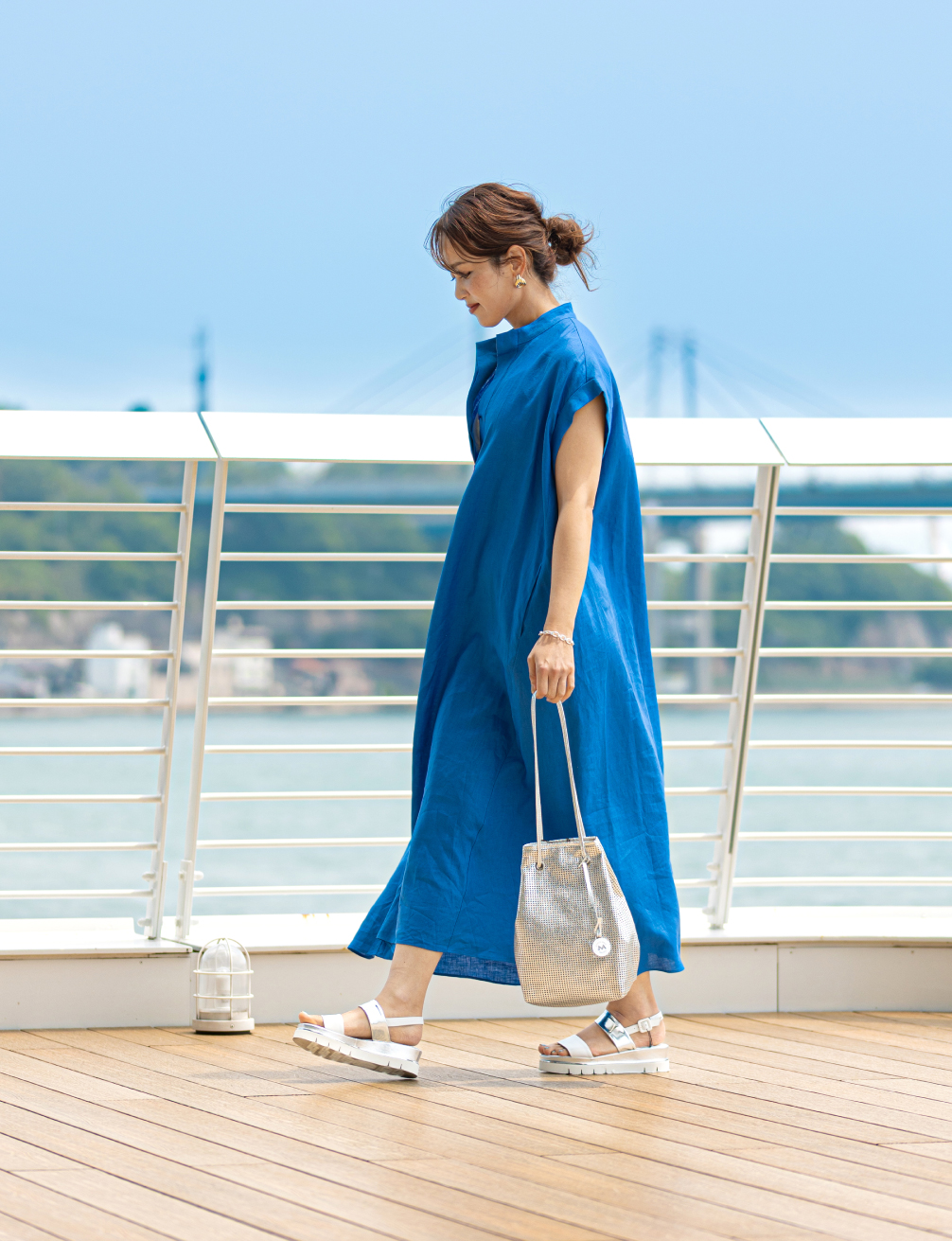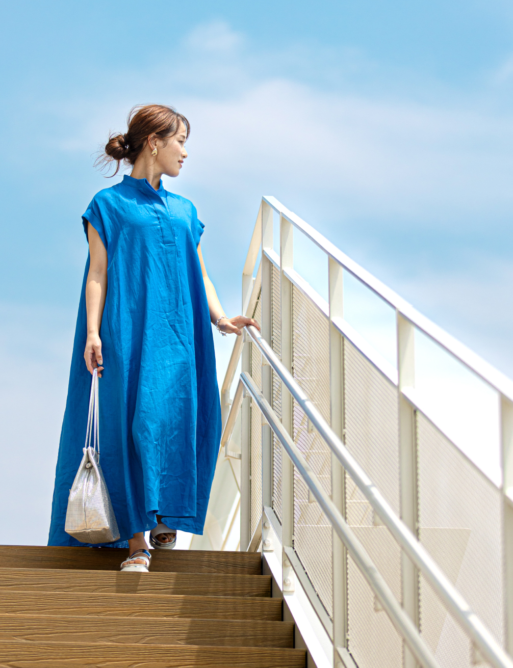 風を受けて揺れるシルエットが視線を惹きつけ、旅先でも日常でも自由に纏いたくなる一着で、華やかさと抜け感がほどよく共存した、心が弾む夏のドレススタイルに。