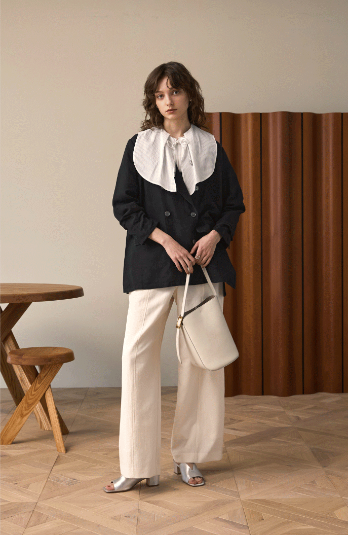 コンサバなブラックのリネンテーラードジャケットに合わせたのは、ビッグカラーのブラウス。爽やかなマリンスタイルで、春夏もレイヤードを楽しみたい。