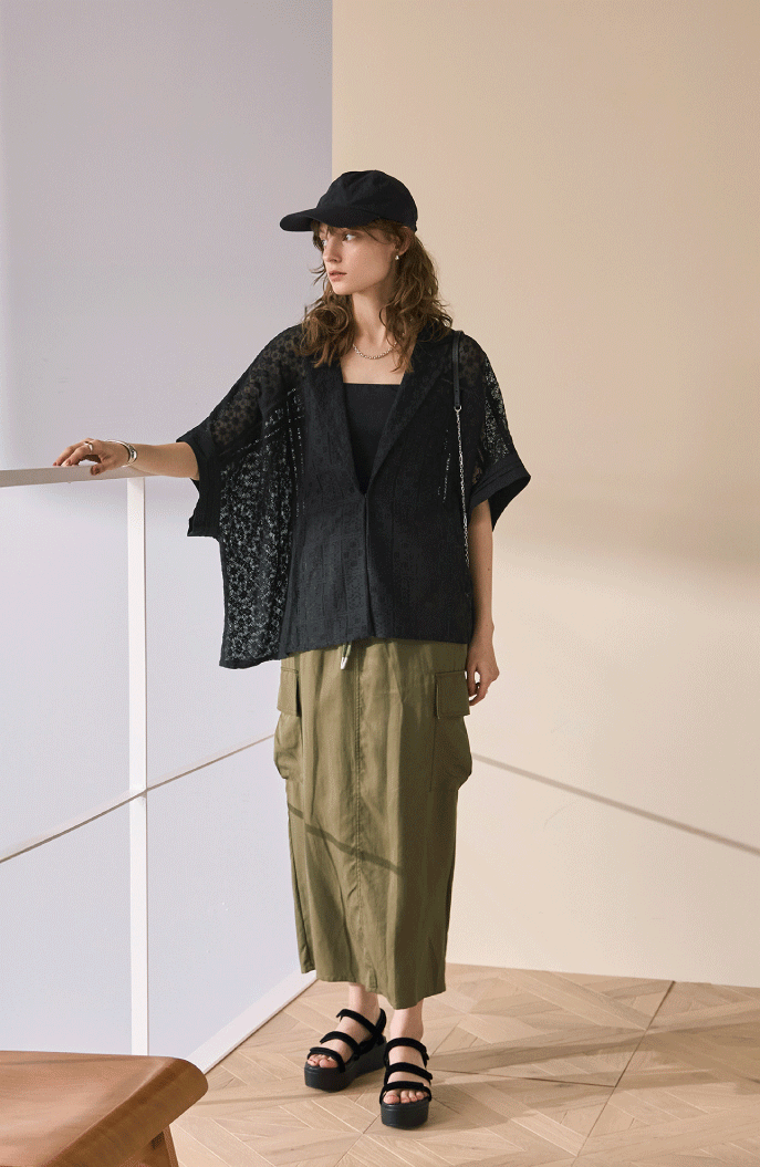 フェミニンなレースジャケットはミリタリーアイテムとのミックススタイルでカジュアルダウン。普段のスタイリングを格上げしてくれる。