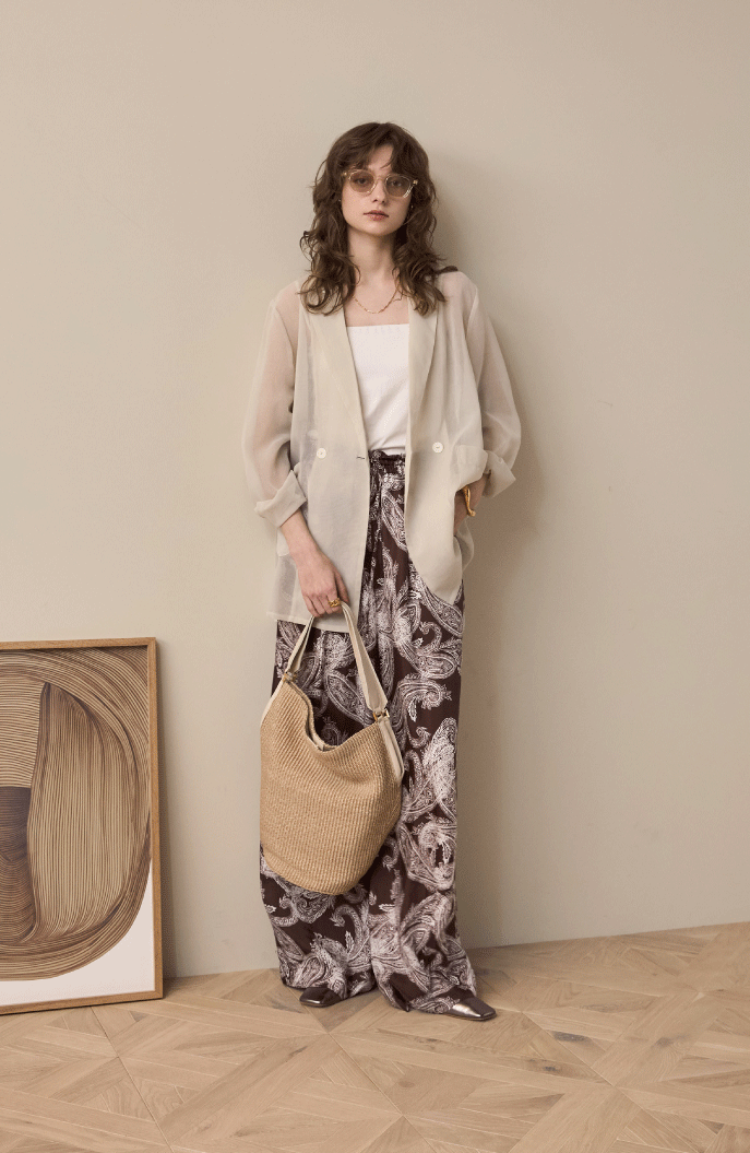 日除けや冷房対策で初秋まで使えるシアージャケットは今季必須アイテム。ヴィンテージ感のある柄のパンツに合わせて、トレンドなスタイルを楽しんで。