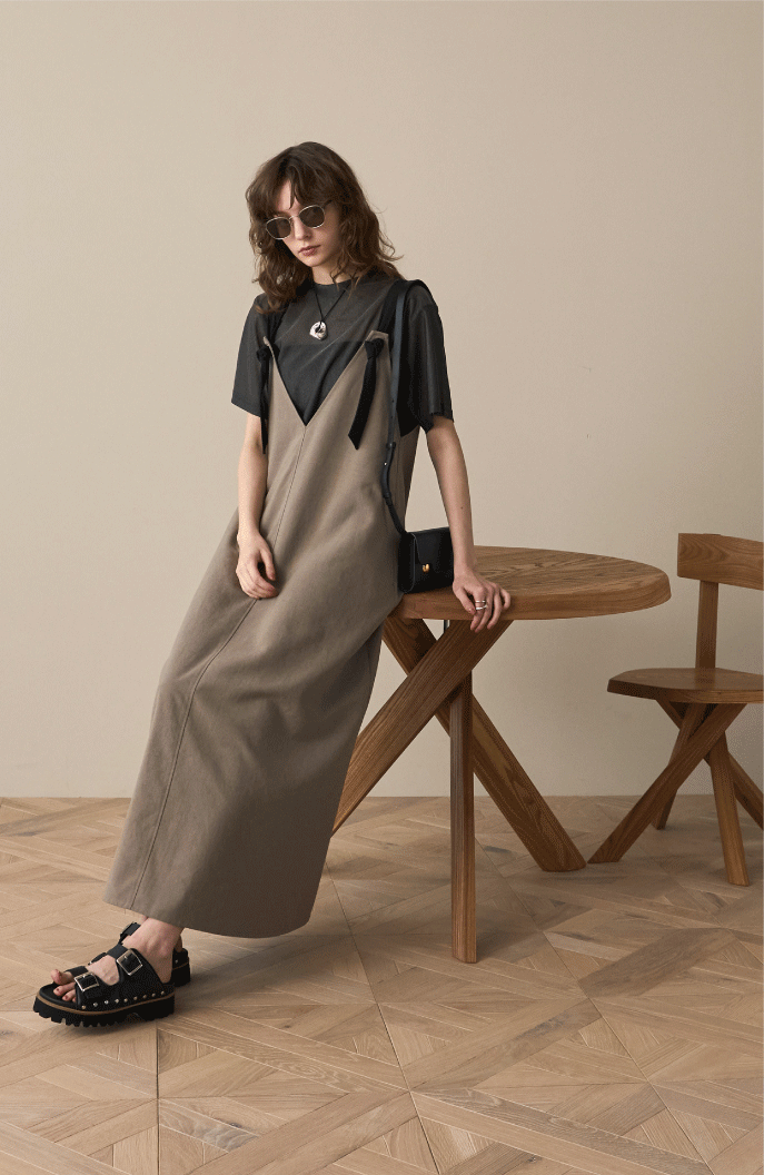 ウエストがシェイプされたタック入りのドレスは、リネンライクな素材で真夏にも活躍するアイテム。1枚での着用だけでなく、デニムレイヤードでカジュアルに着崩したり、羽織としても活用できる。
