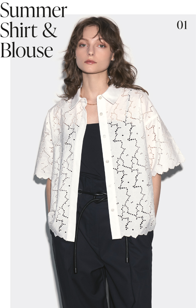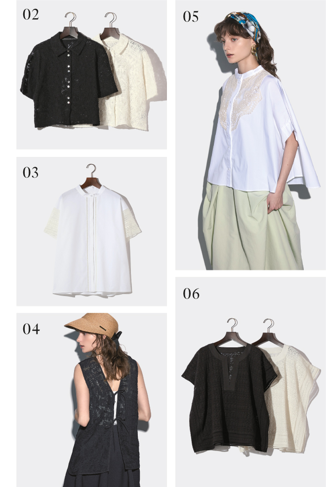 02_ コットンネットレースにコード刺繍を施した素材でシンプルながらも高級感と個性を兼ね備えたシャツ。
