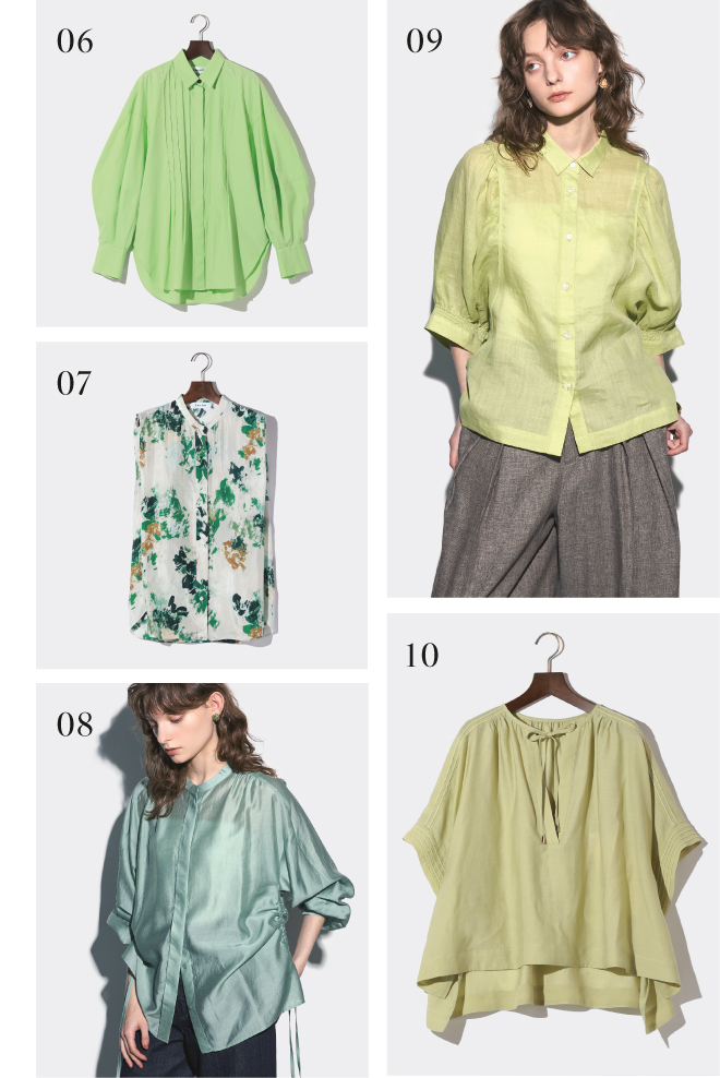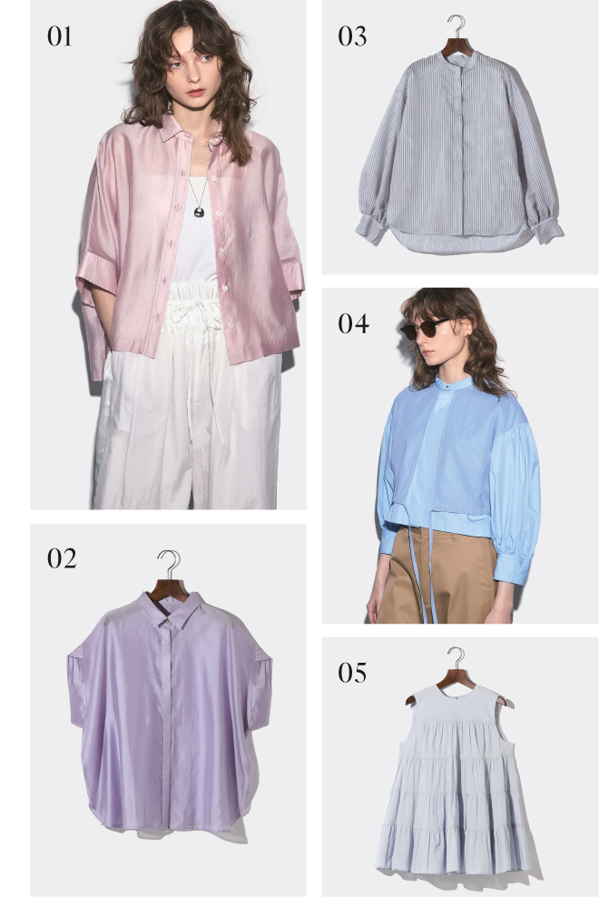 08_ 光沢感のあるシアー素材が美しいバンドカラーシャツ。両サイドはドローストリング仕様で、好みに合わせてアレンジできる。