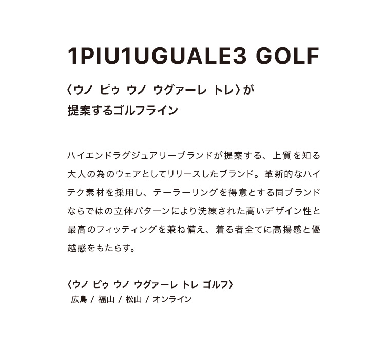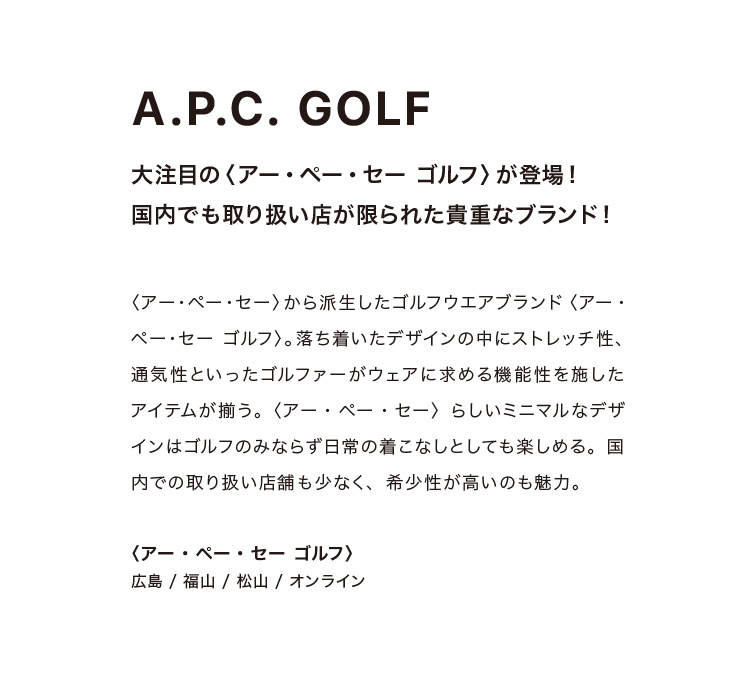 多くのご要望に応え、待望のゴルフブランドの取扱いがスタート!パリゴメンズにて4月14日(金)より販売開始いたします。 PARIGOTメンズのフィルターを通したラグジュアリーな大人のためのゴルフウェアを展開。是非ご期待くださいませ!