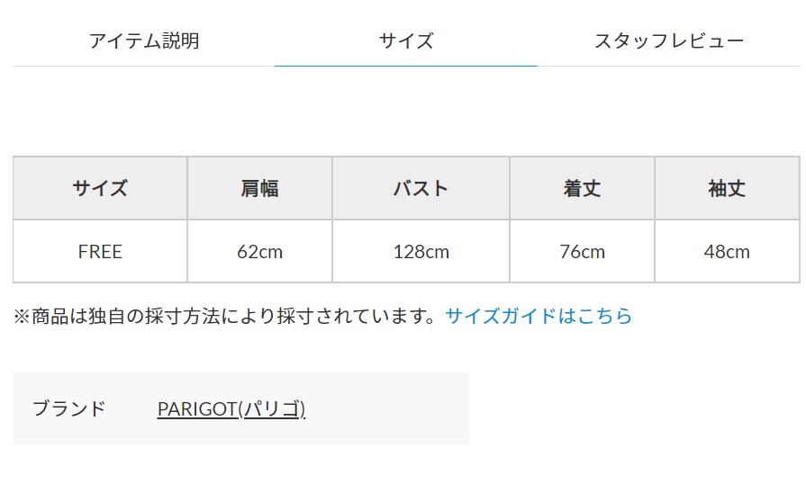 PARIGOTの商品はサイズガイドにしたがって、独自の採寸方法によるサイズを商品ページの「サイズ・詳細」に掲載しています。