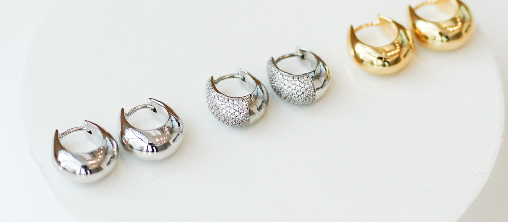 近年人気が急激に高まり、Ice Huggiesなど指名買いが多いのがピアス。シルバーとゴールドからお選びいただけます。